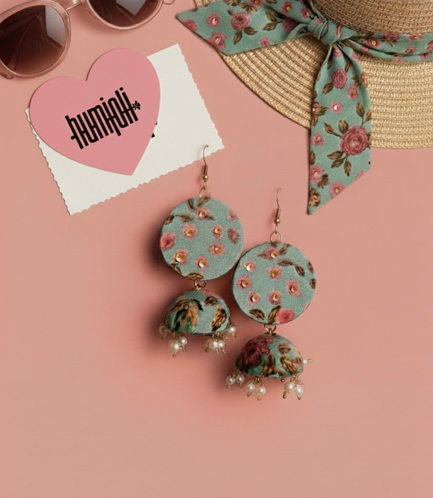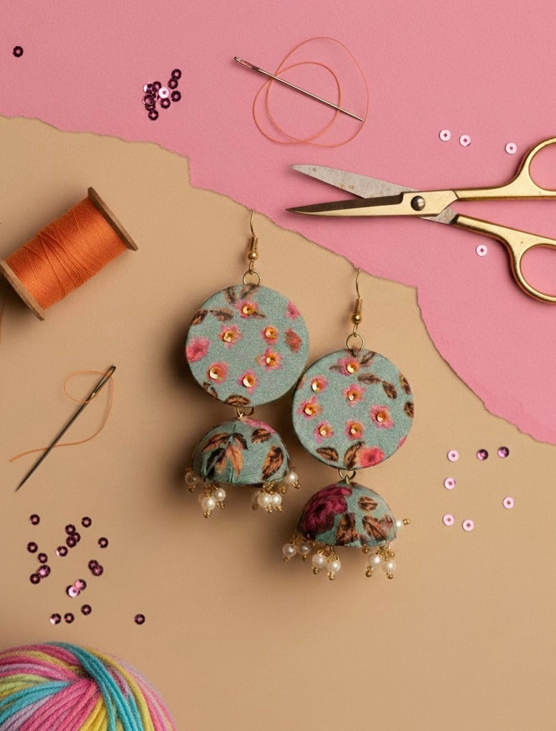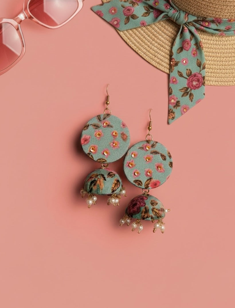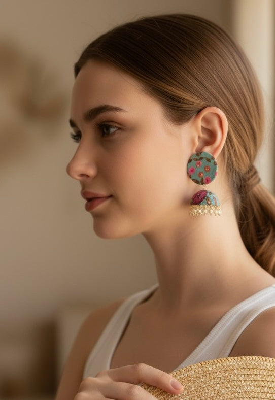 stylize ur outfit with aqua blue earings with sitara work and jhumki with hanging small pearls.