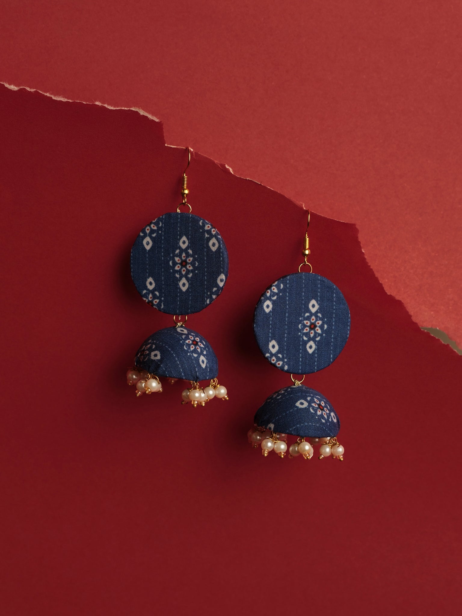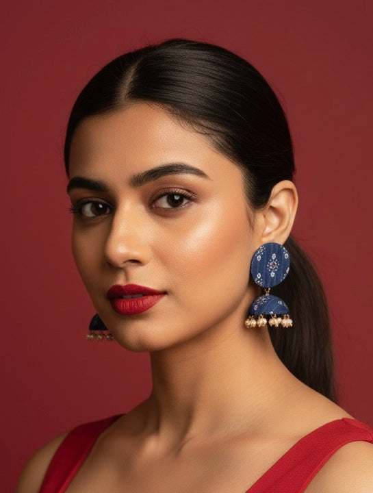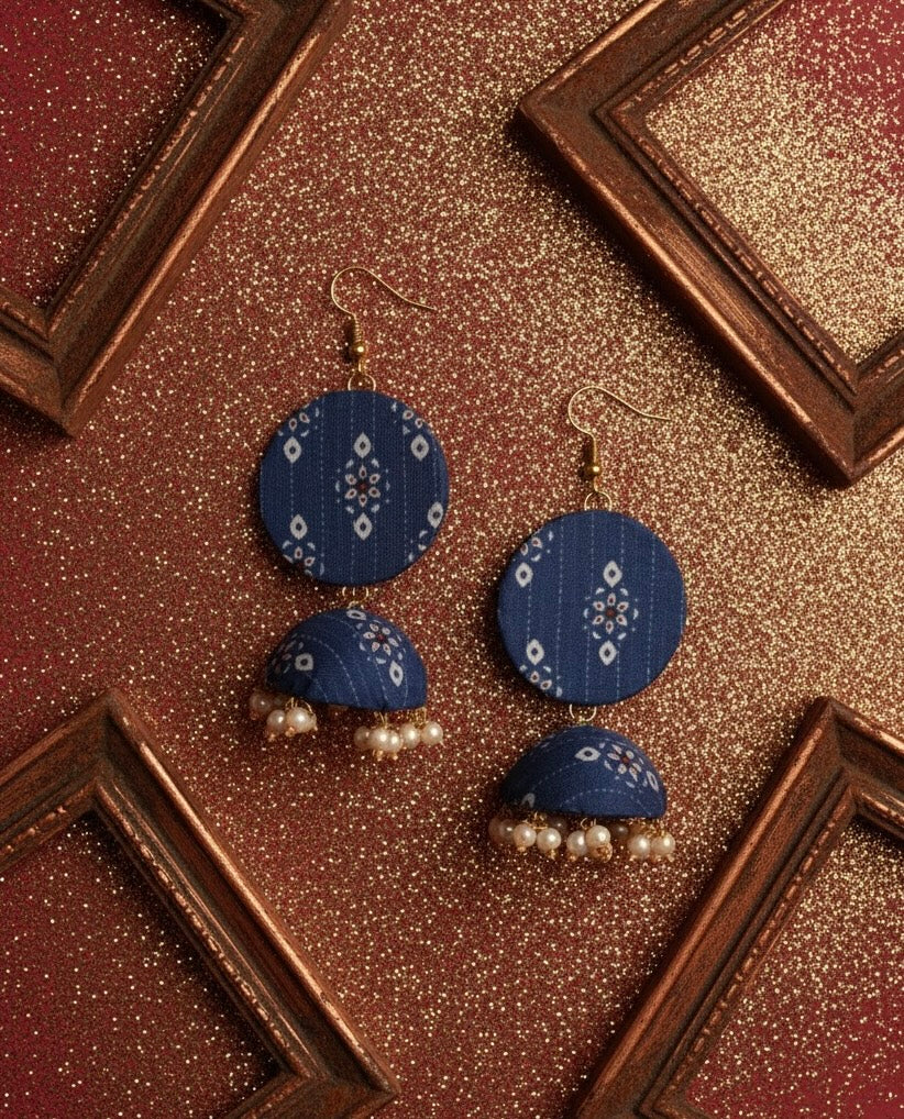 stylize ur outfit with nevi blue earings and jhumki with hanging small pearls.