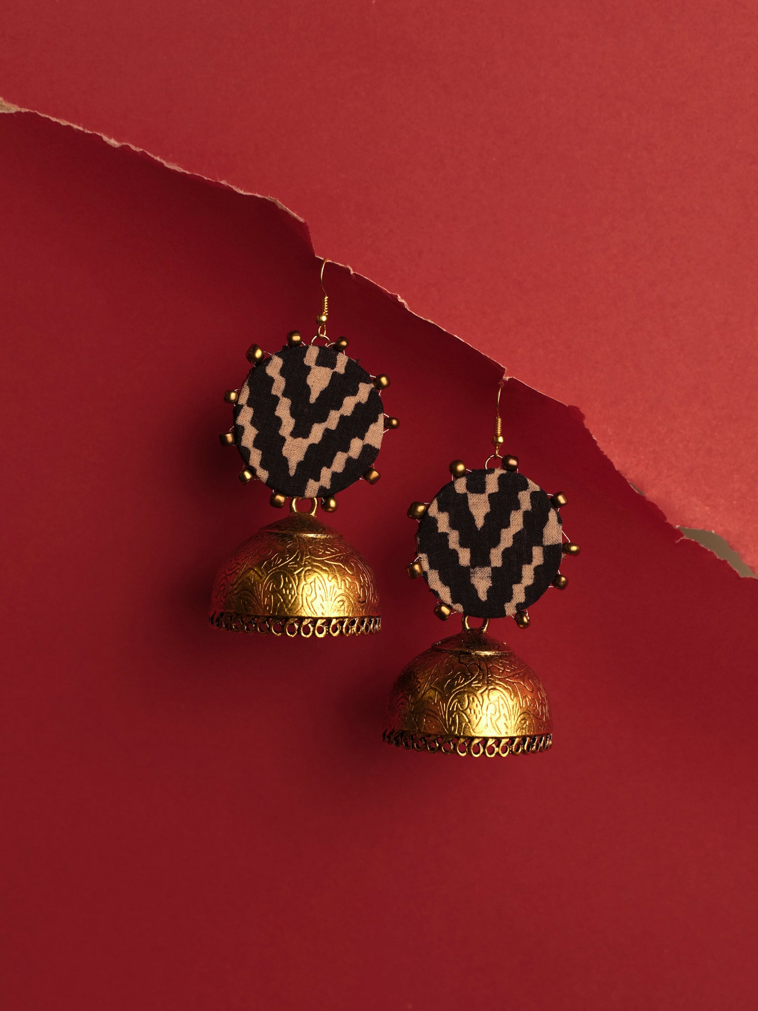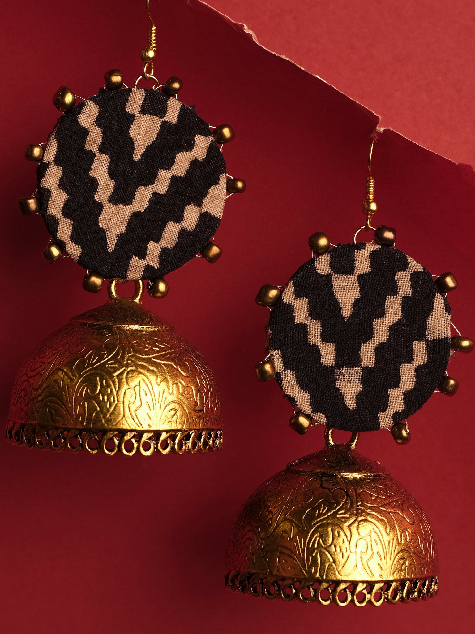 stylize ur outfit with black and white ajrak earings with bead work on the sides and copper antique jhumka.