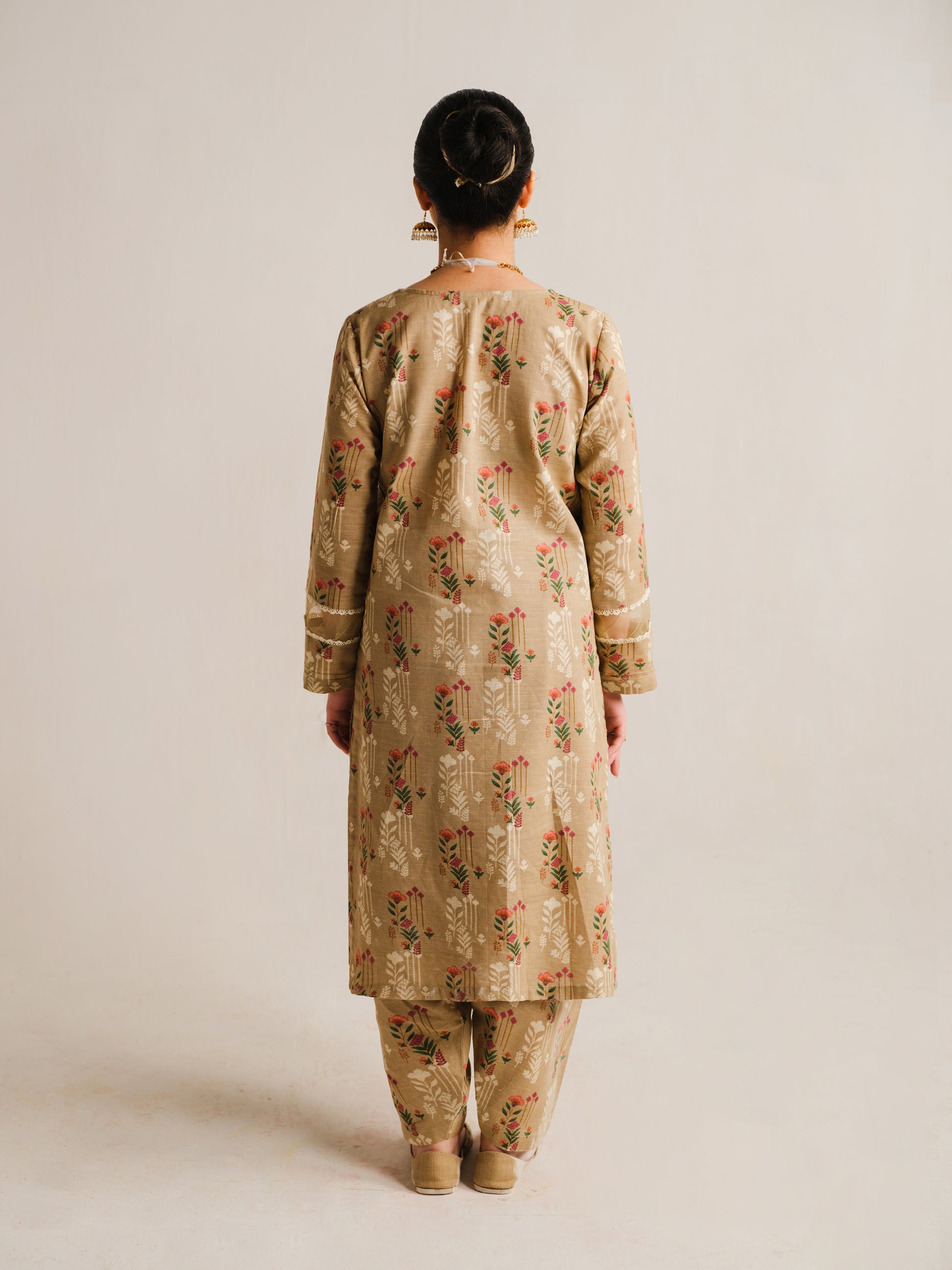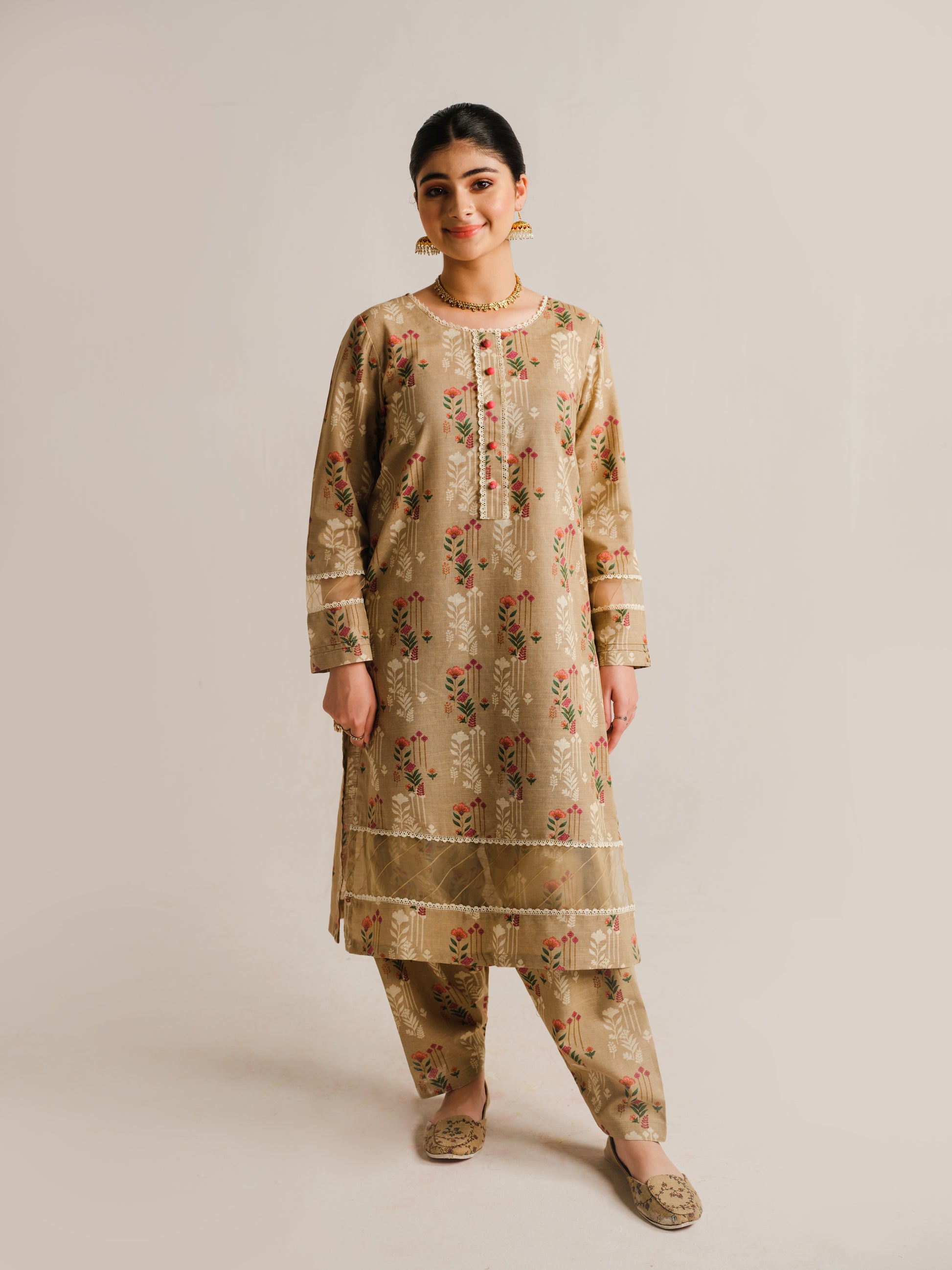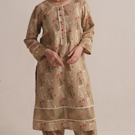 Step into refined grace with our 2-piece khaddar ensemble. The elegant beige printed long shirt, adorned with delicate lace and loop details on the neckline and sleeves, harmoniously pairs with the matching printed trouser.