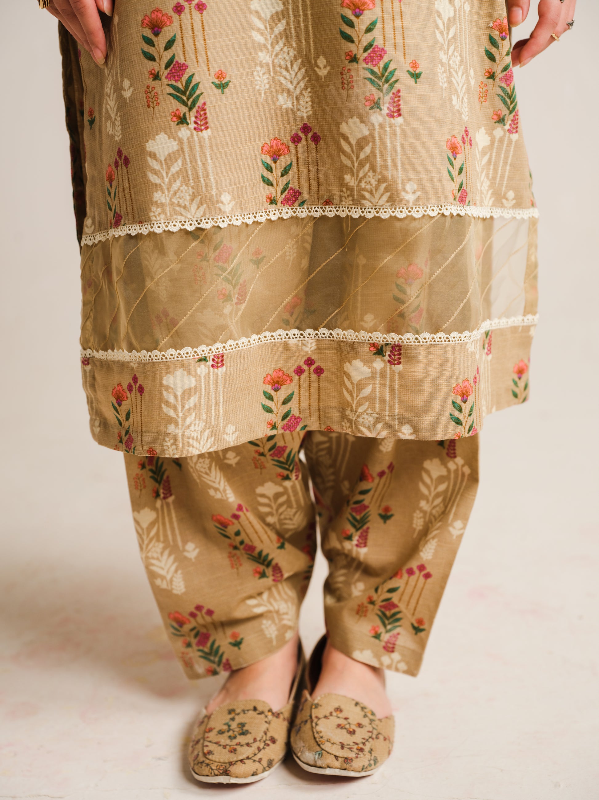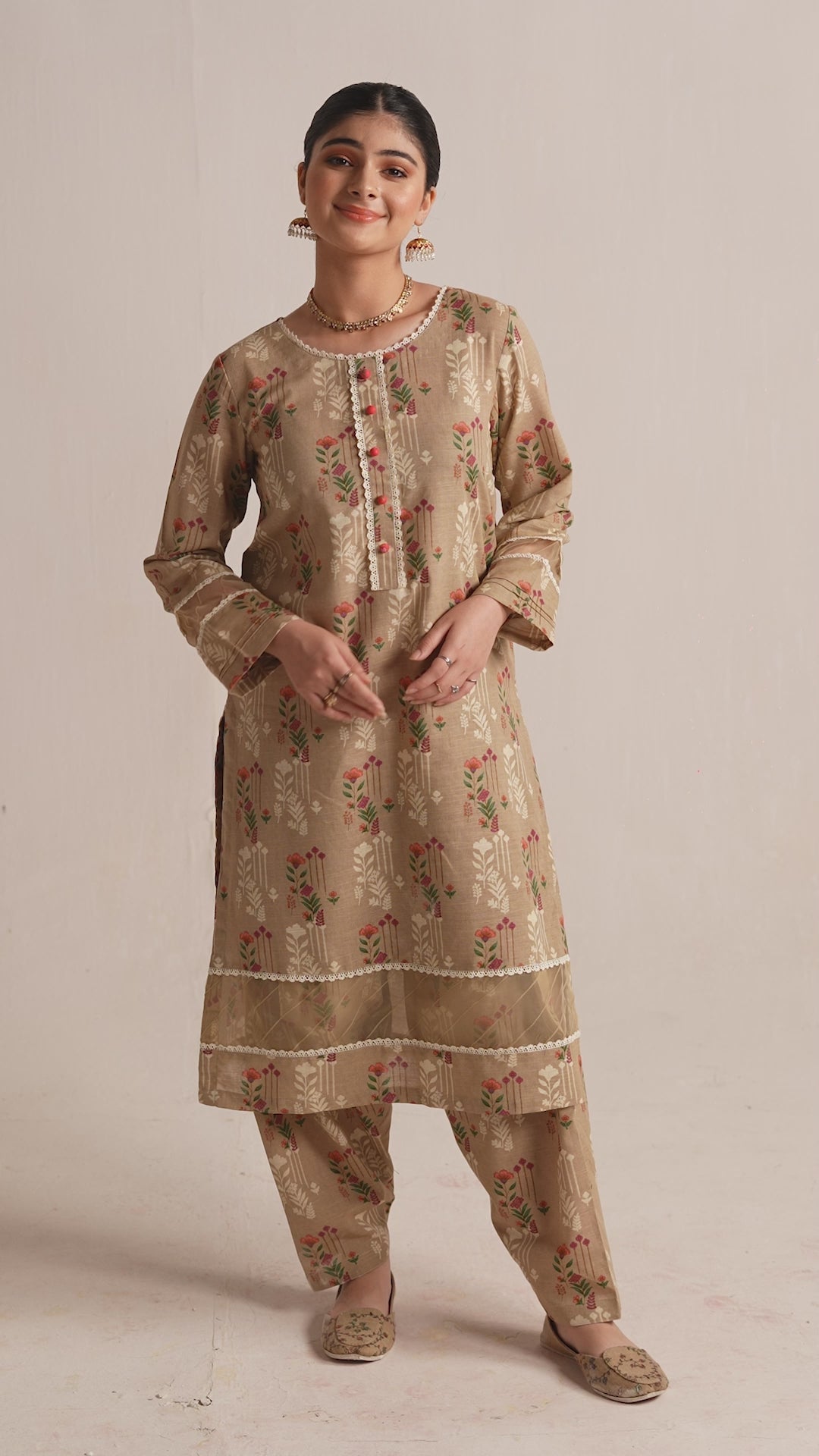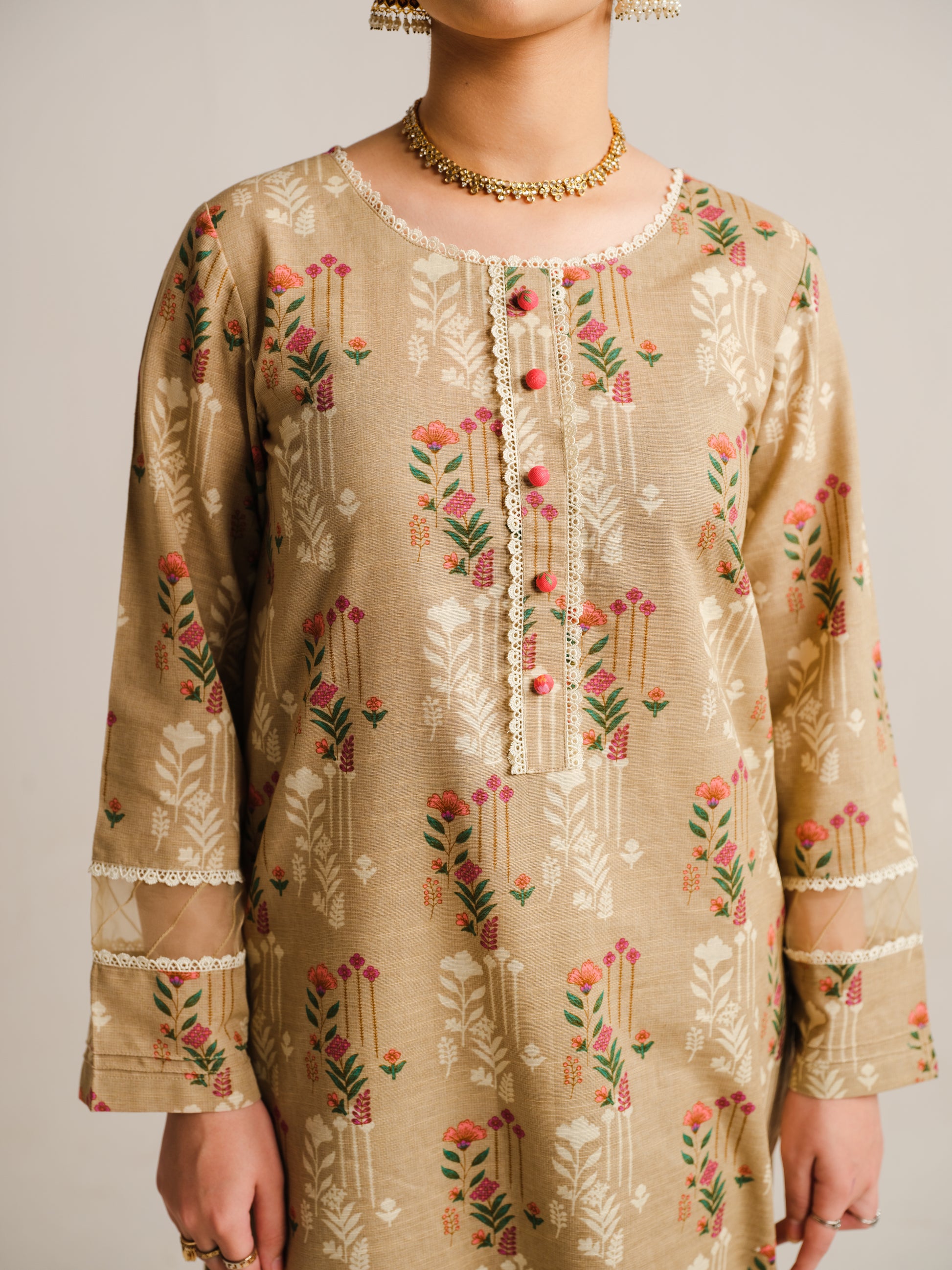 Step into refined grace with our 2-piece khaddar ensemble. The elegant beige printed long shirt, adorned with delicate lace and loop details on the neckline and sleeves, harmoniously pairs with the matching printed trouser.