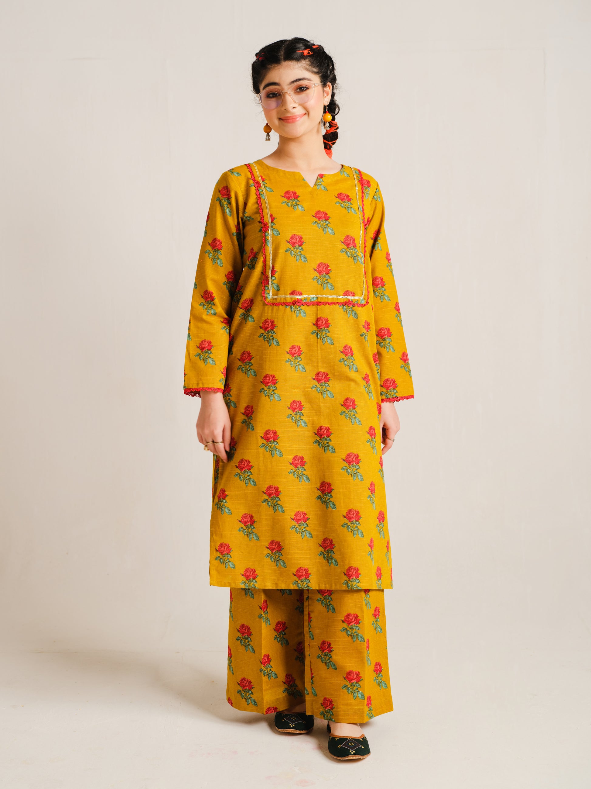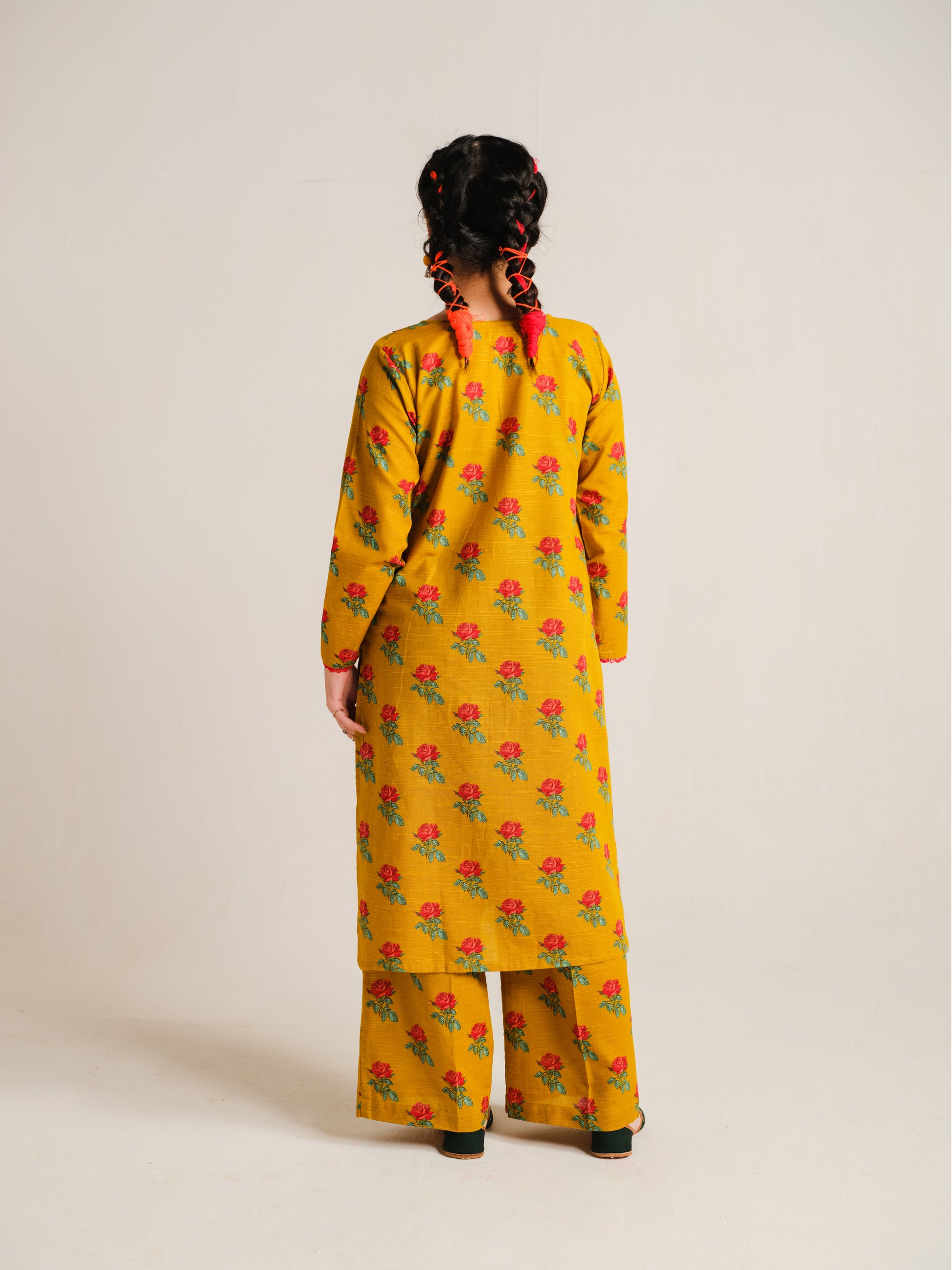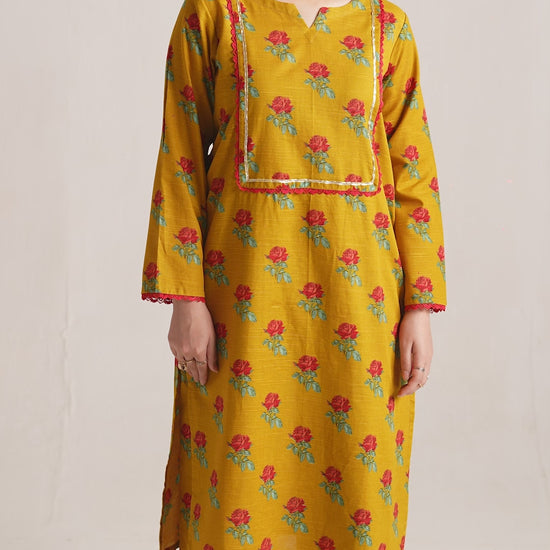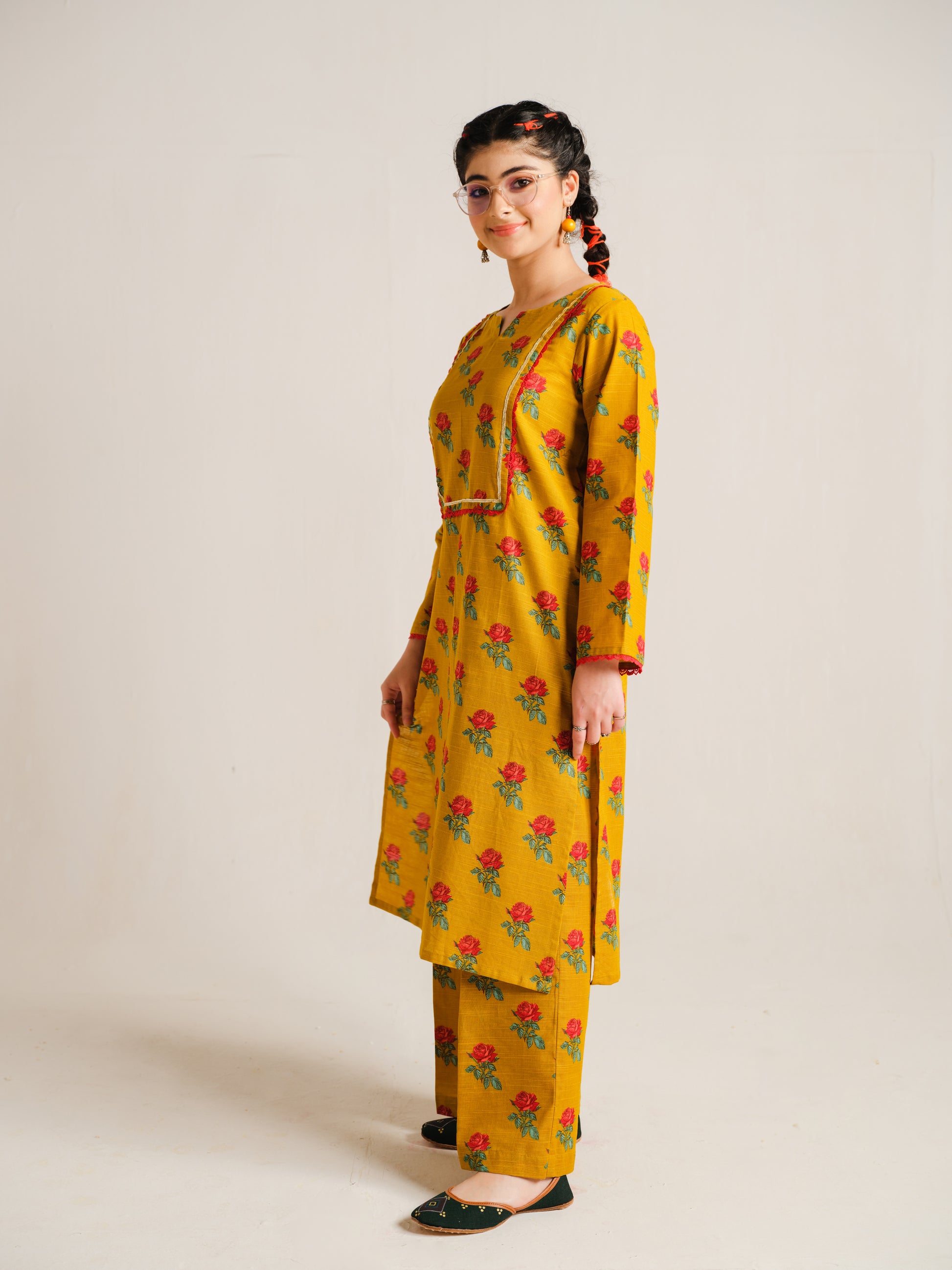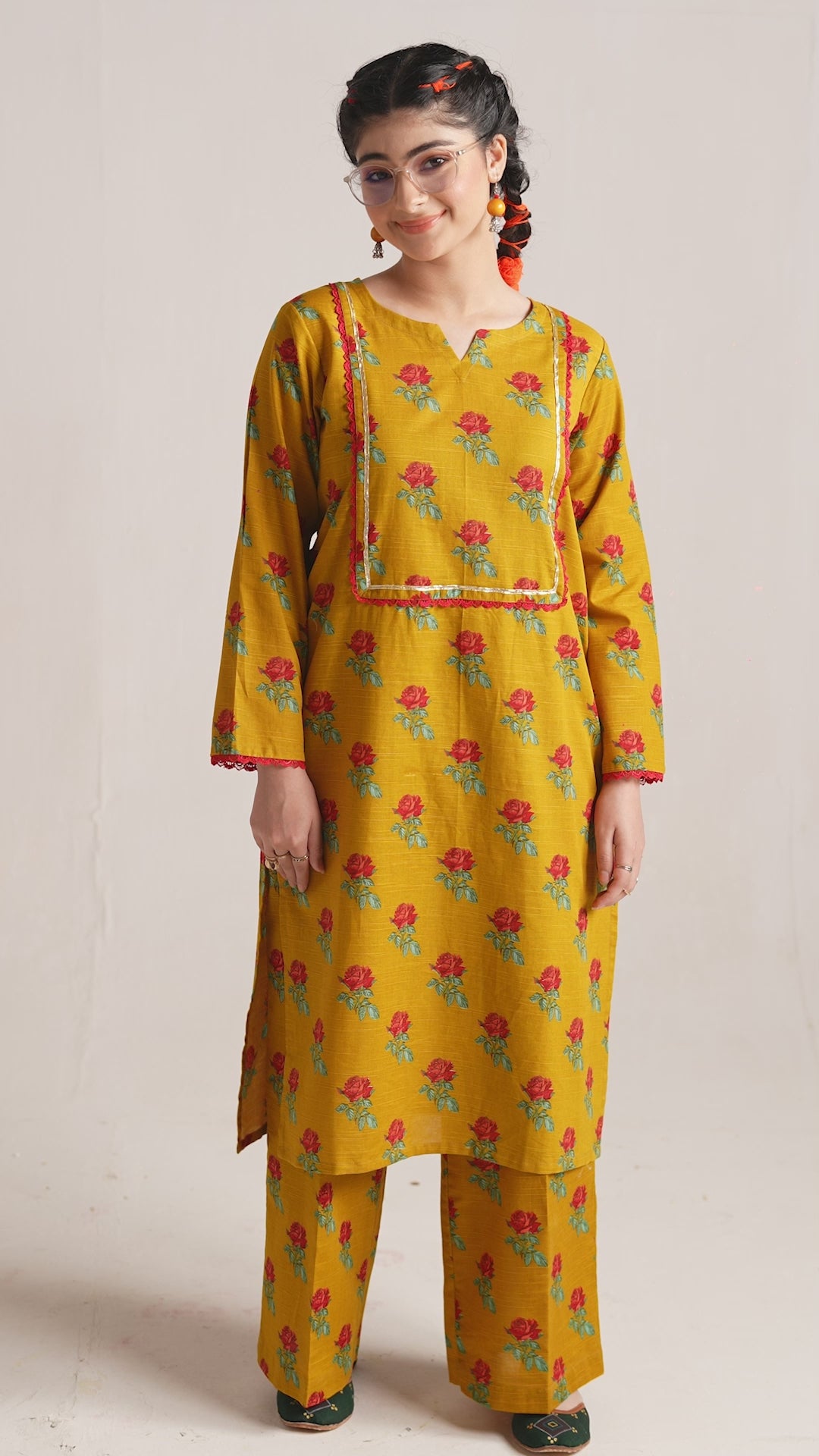 Indulge in timeless grace with our 2-piece khaddar ensemble. A captivating yellow printed long shirt, adorned with delicate lace and loop accents on the neckline and sleeves, perfectly pairs with the printed trouser.