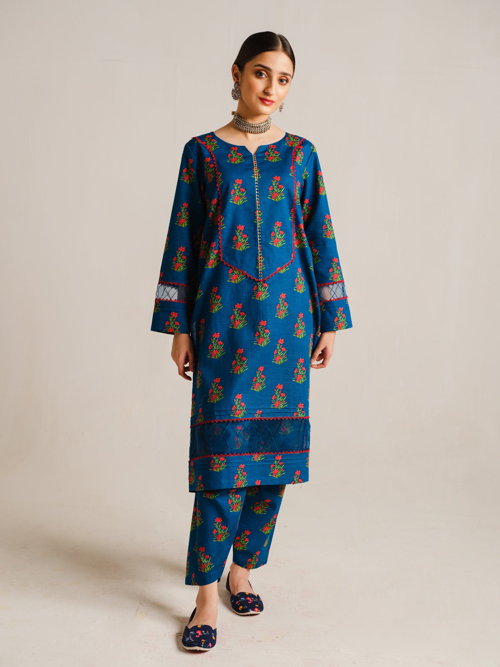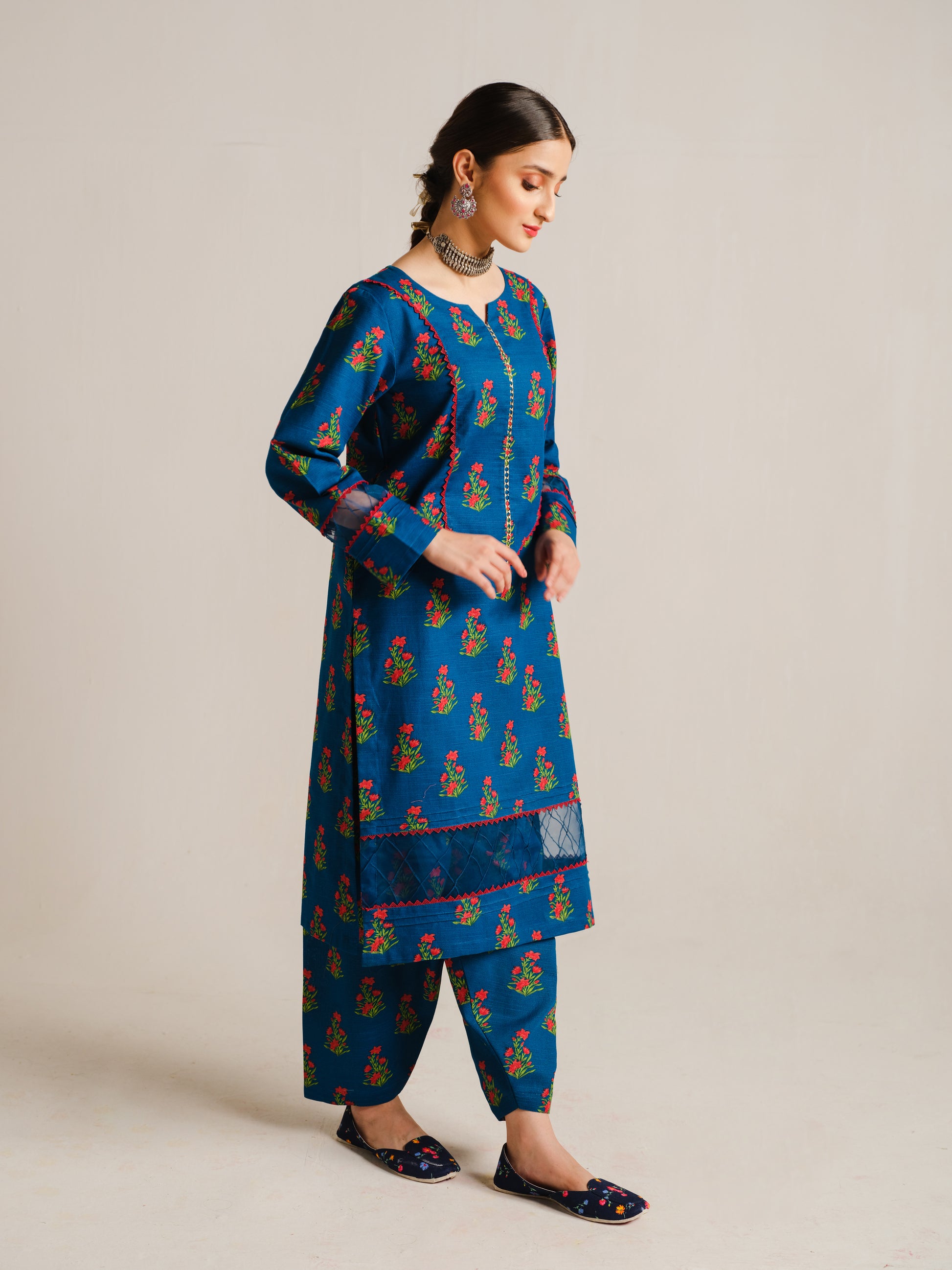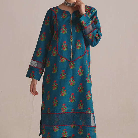 This beautiful and distinctive 2-piece khaddar dress showcases a serene blue long shirt adorned with vibrant green and red flower prints, featuring delicate lace and loop details on the neckline and sleeves, and is paired flawlessly with a printed trouser.