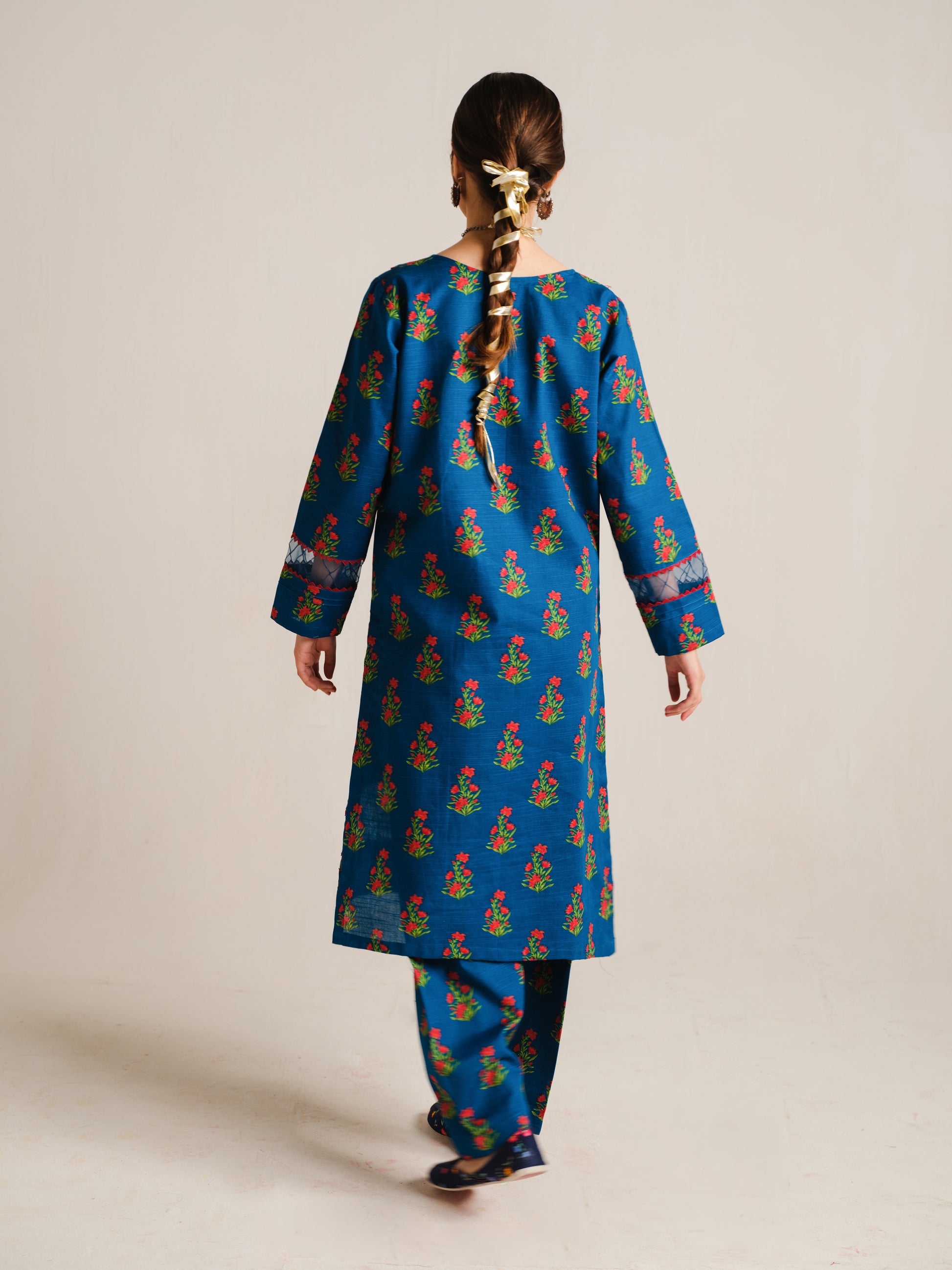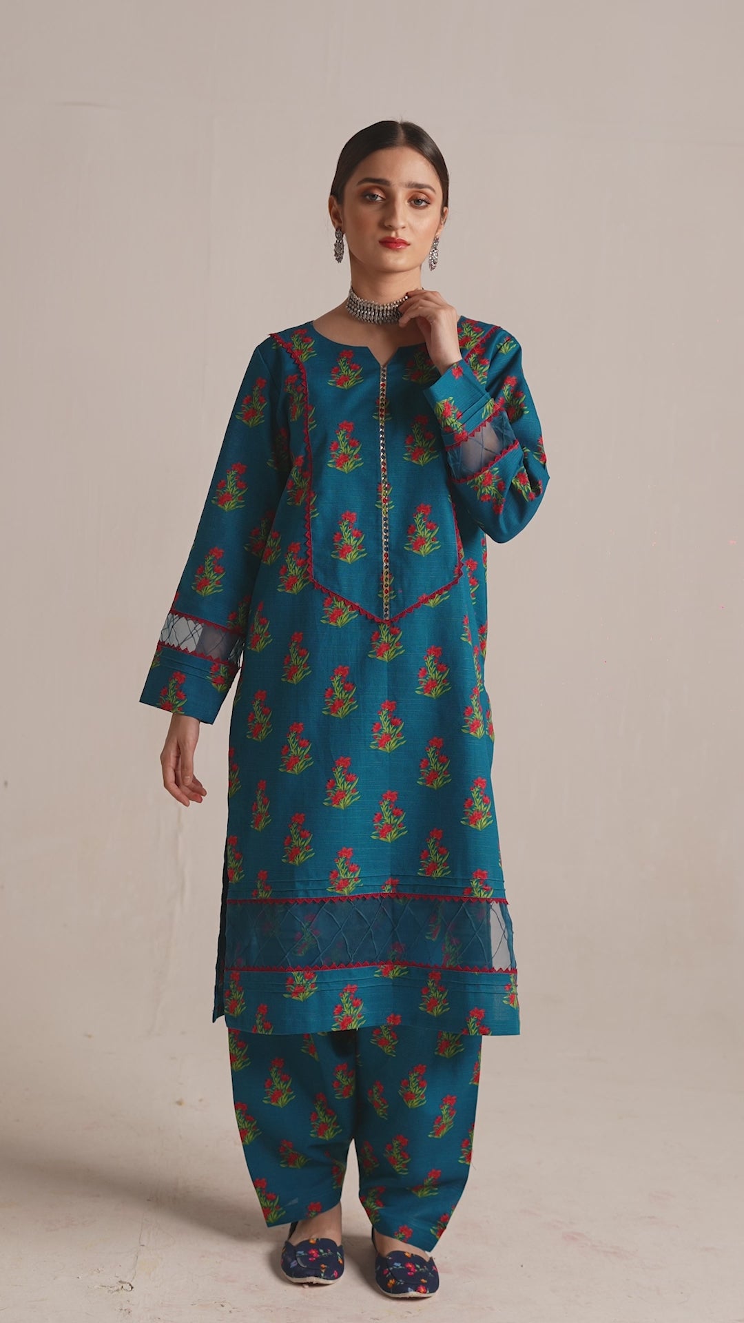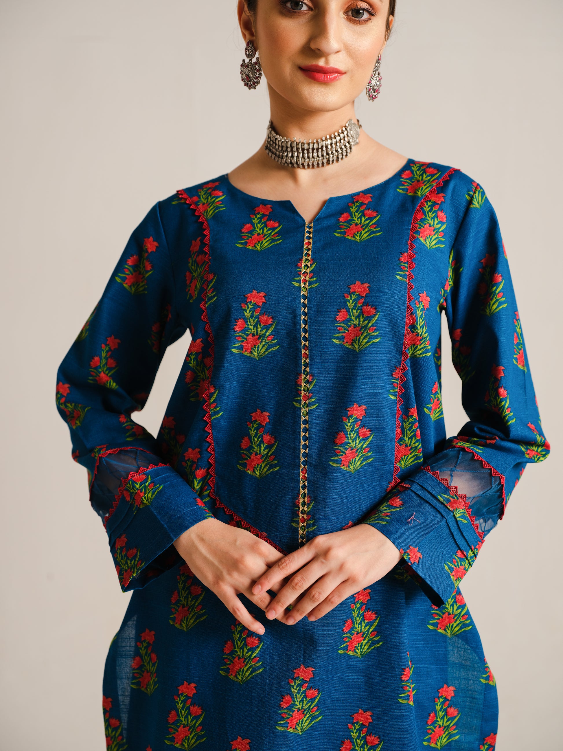 This beautiful and distinctive 2-piece khaddar dress showcases a serene blue long shirt adorned with vibrant green and red flower prints, featuring delicate lace and loop details on the neckline and sleeves, and is paired flawlessly with a printed trouser.