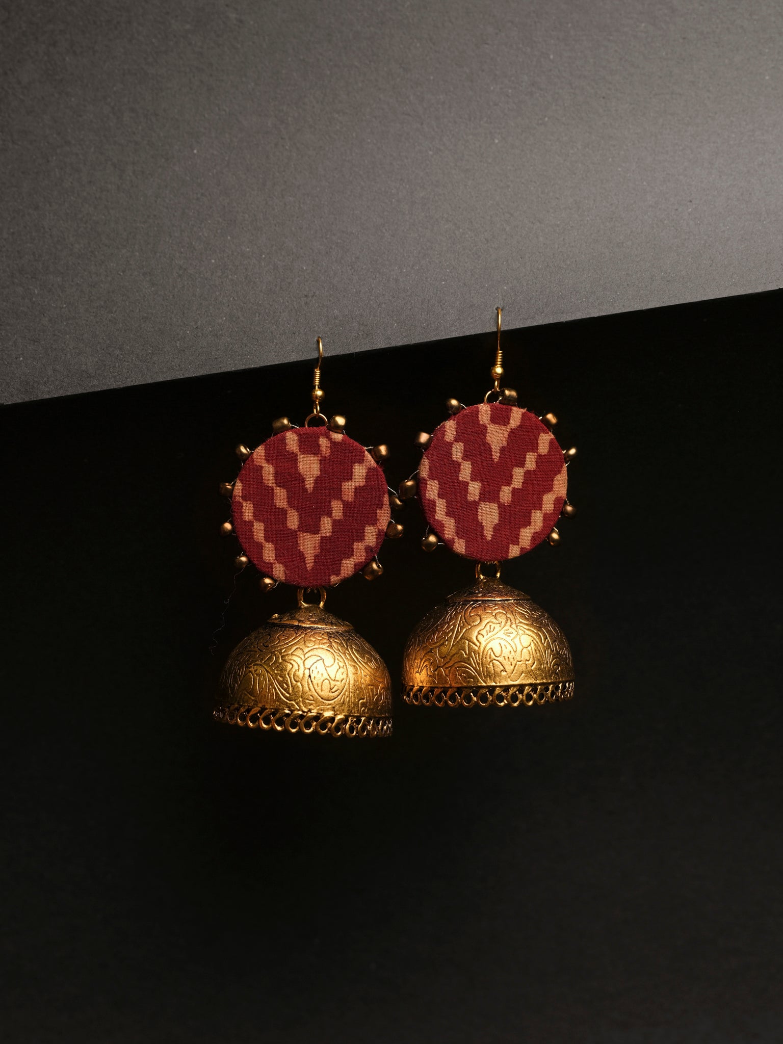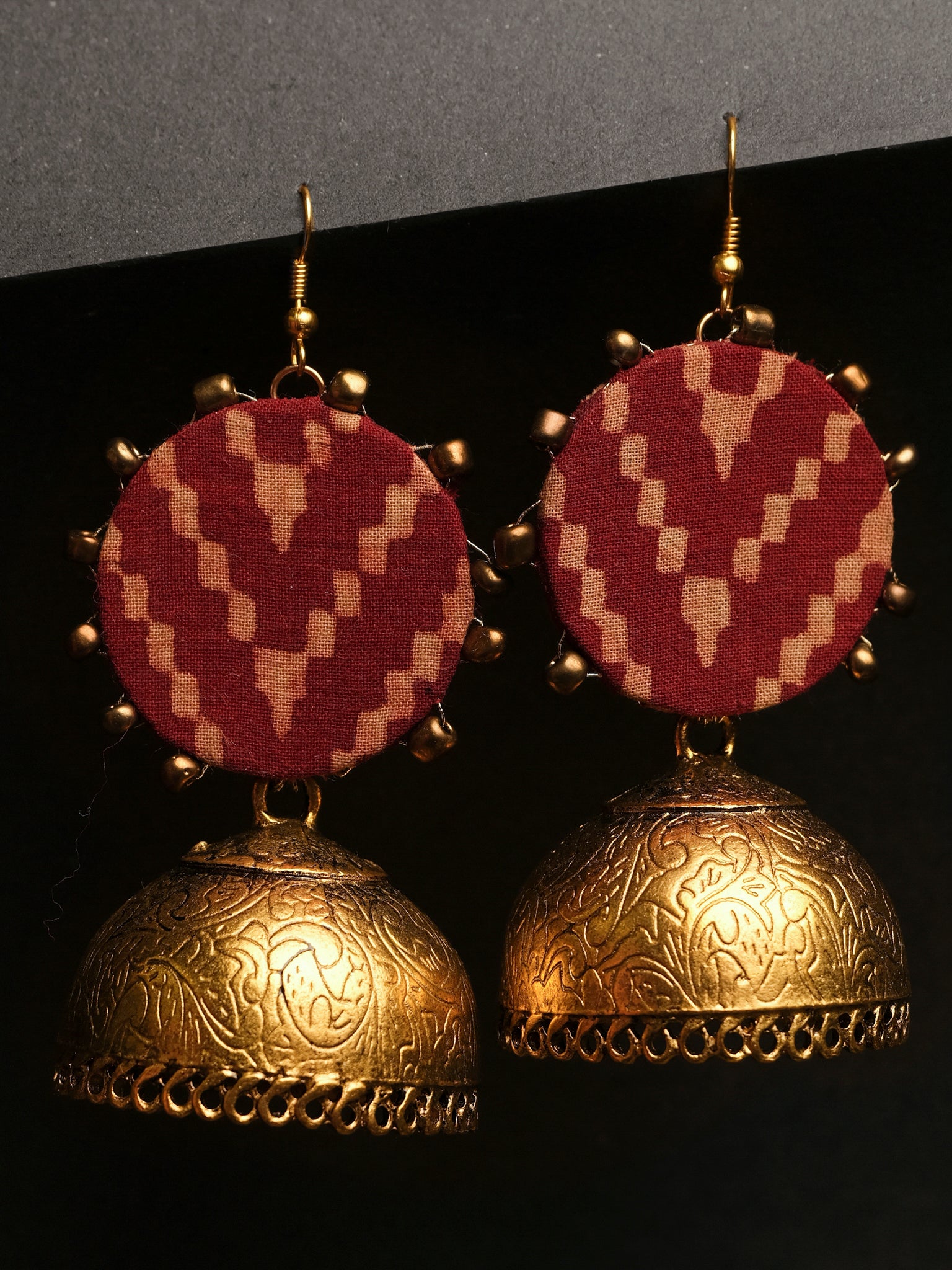 stylize ur outfit with red and white ajrak earings with bead work on the sides and copper antique jhumka.