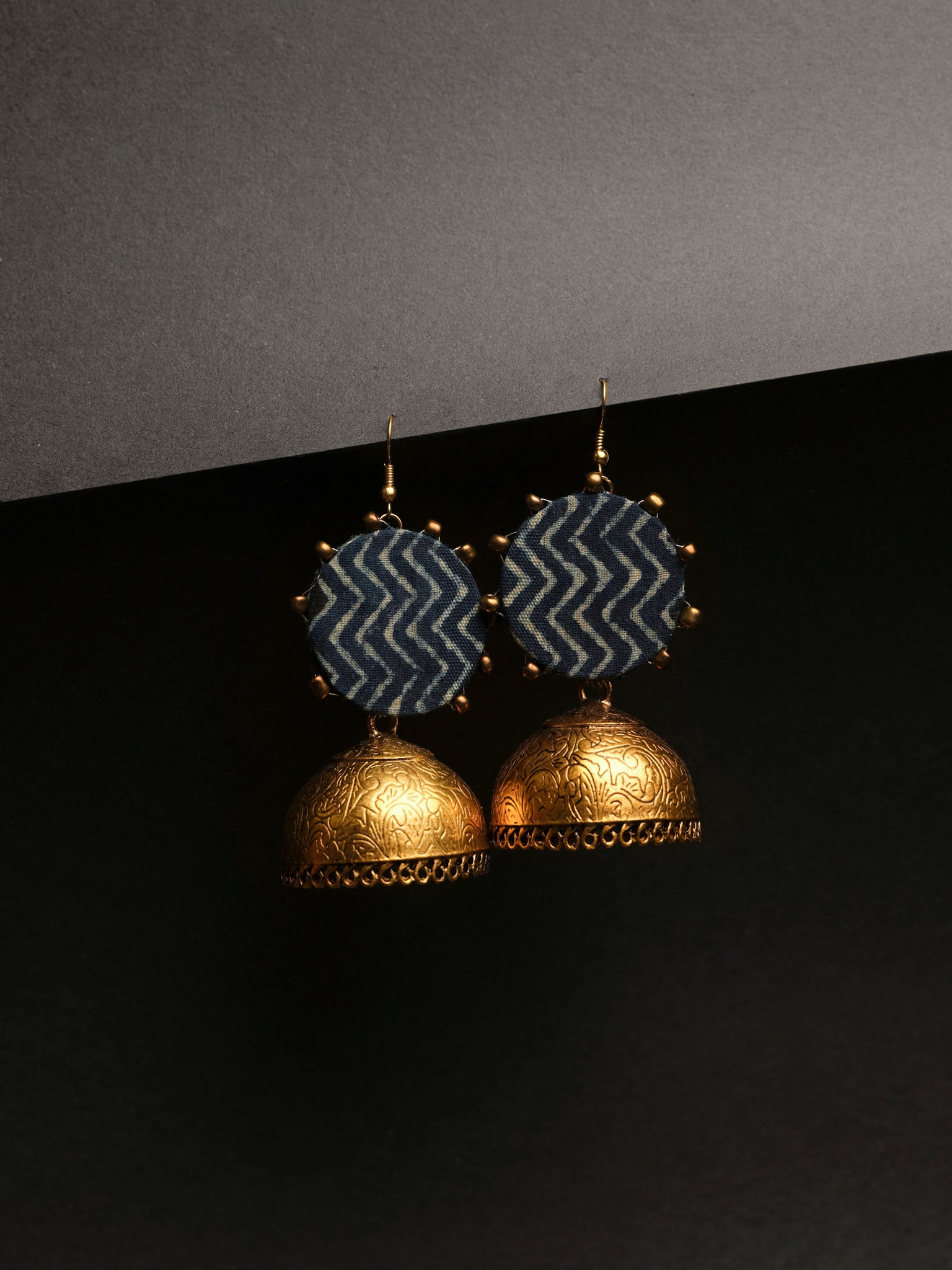 stylize ur outfit withwhite and blue ajrak earings with bead work on the sides and copper antique jhumka.