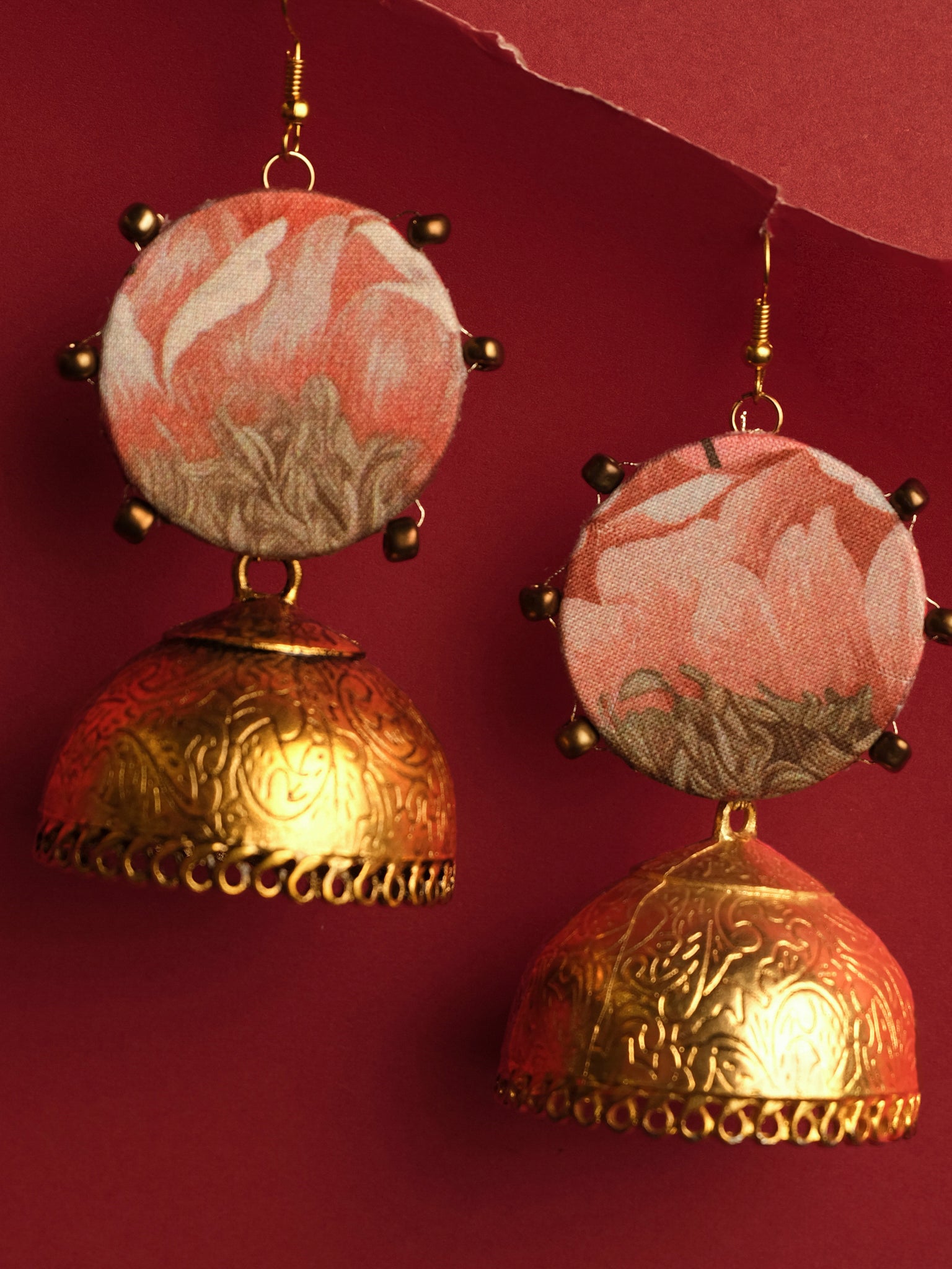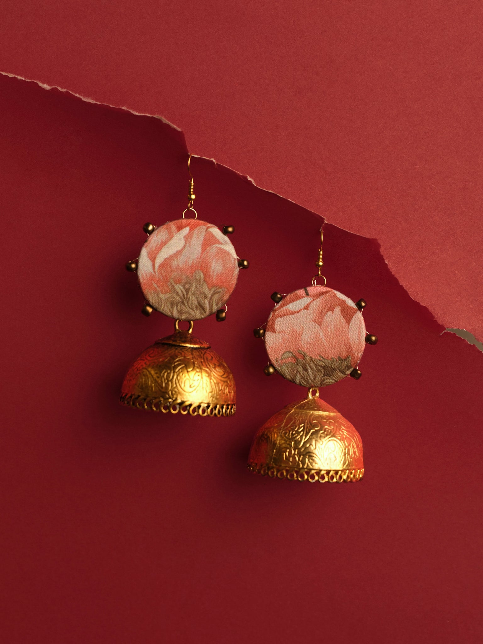 stylize ur outfit with peach earings with bead work on the sides and copper antique jhumka.