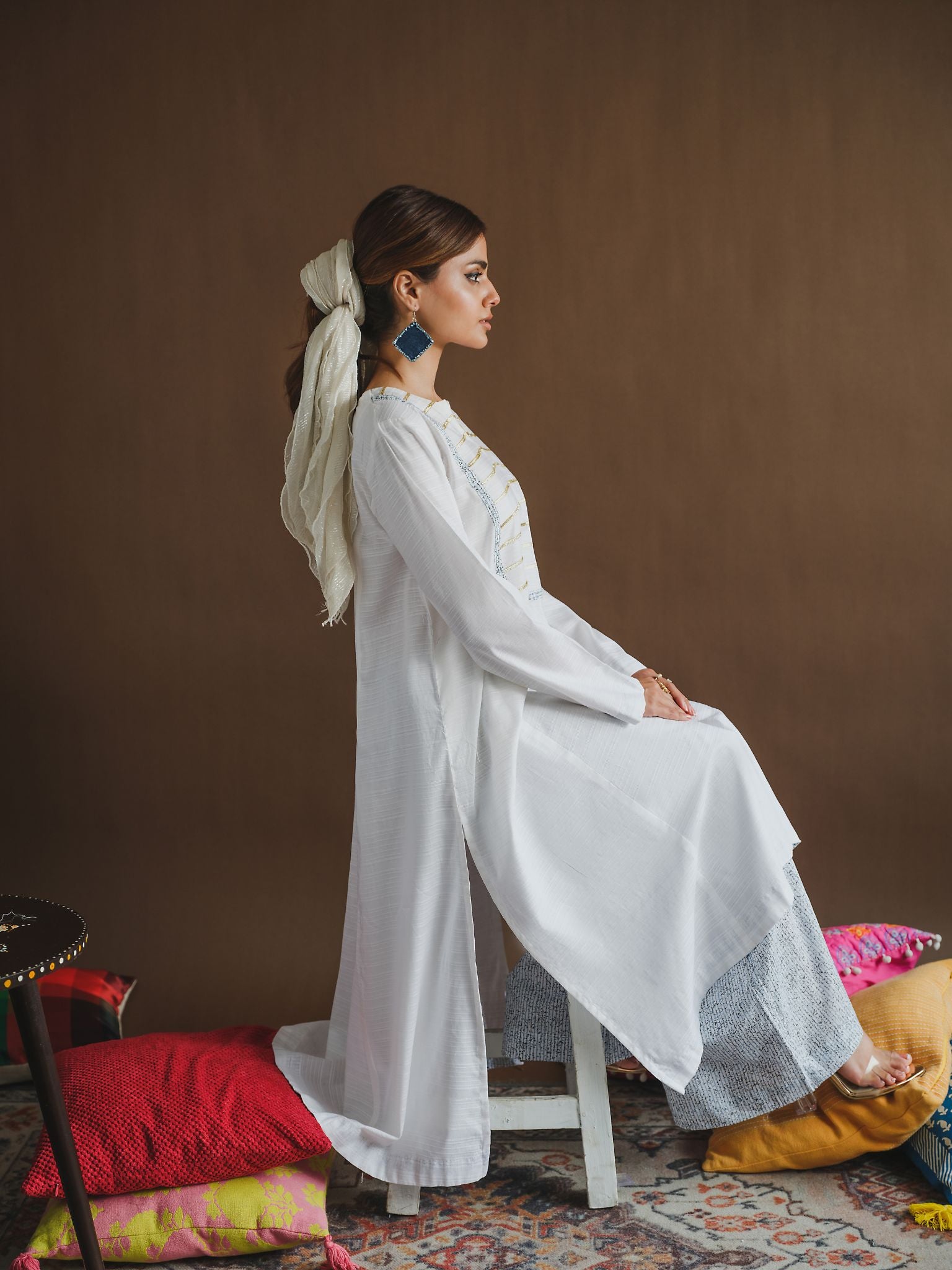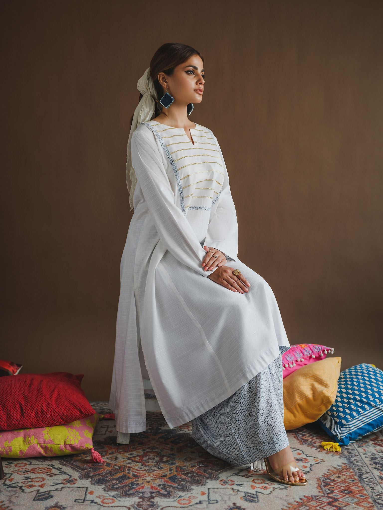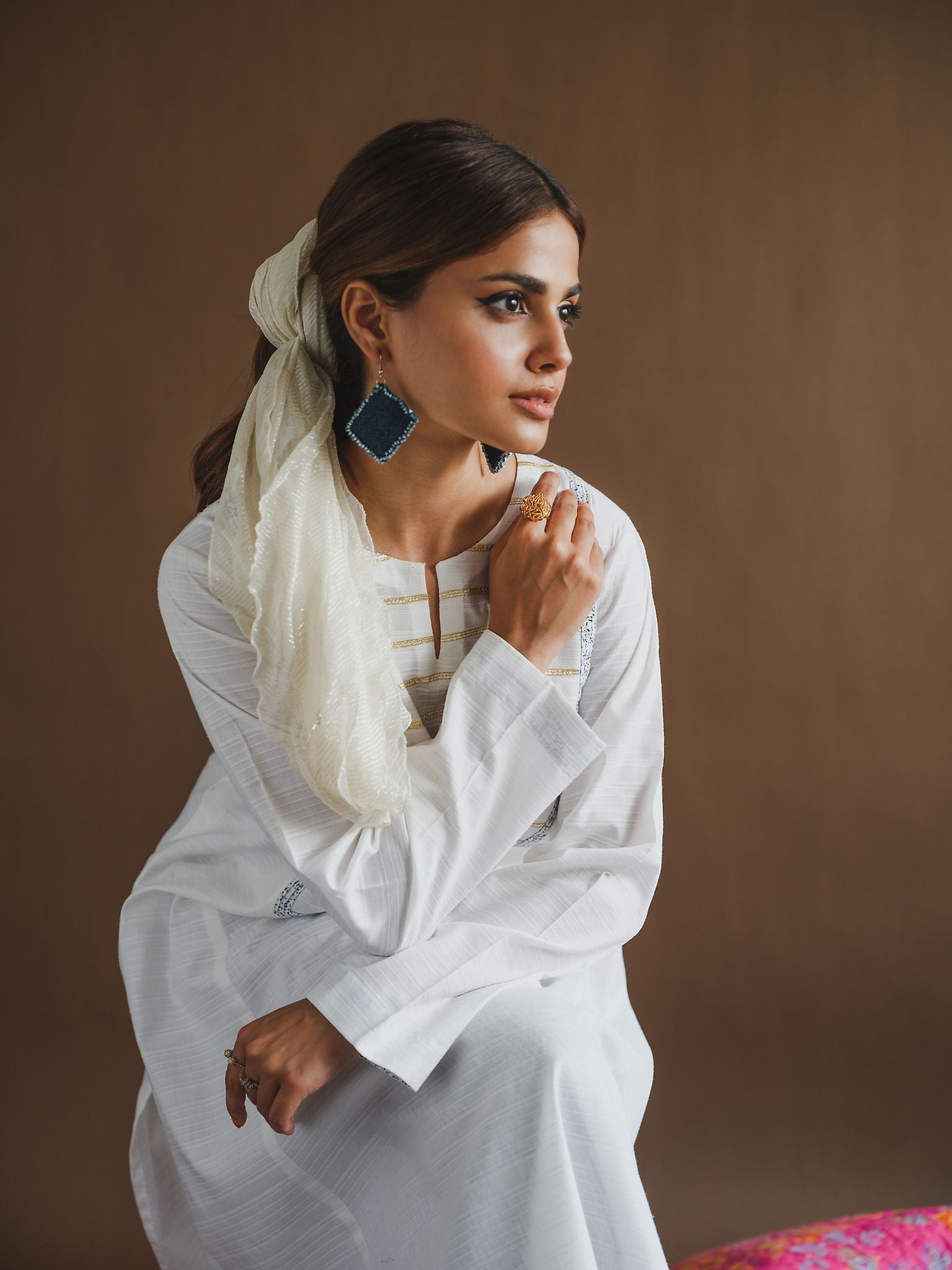 A truly enchanting outfit that exudes elegance. The kameez steals the spotlight with its stunning design delicately encircling the neckline, adding a touch of allure and grace to the overall look. The pristine white hue of the kameez embodies purity and serenity, while the self-print light shade trouser perfectly complements the ensemble, creating a harmonious and balanced aesthetic.