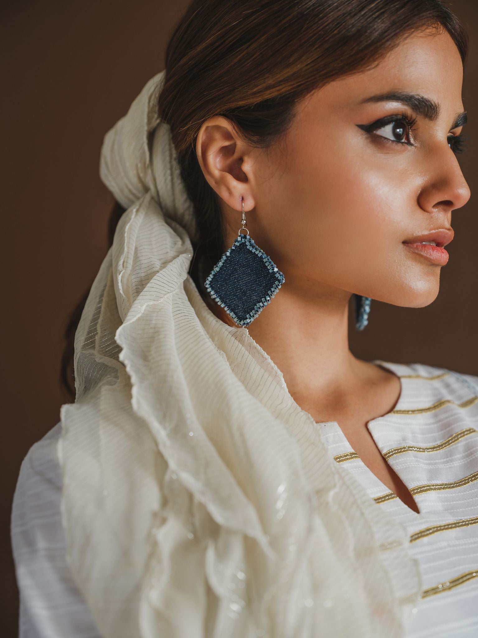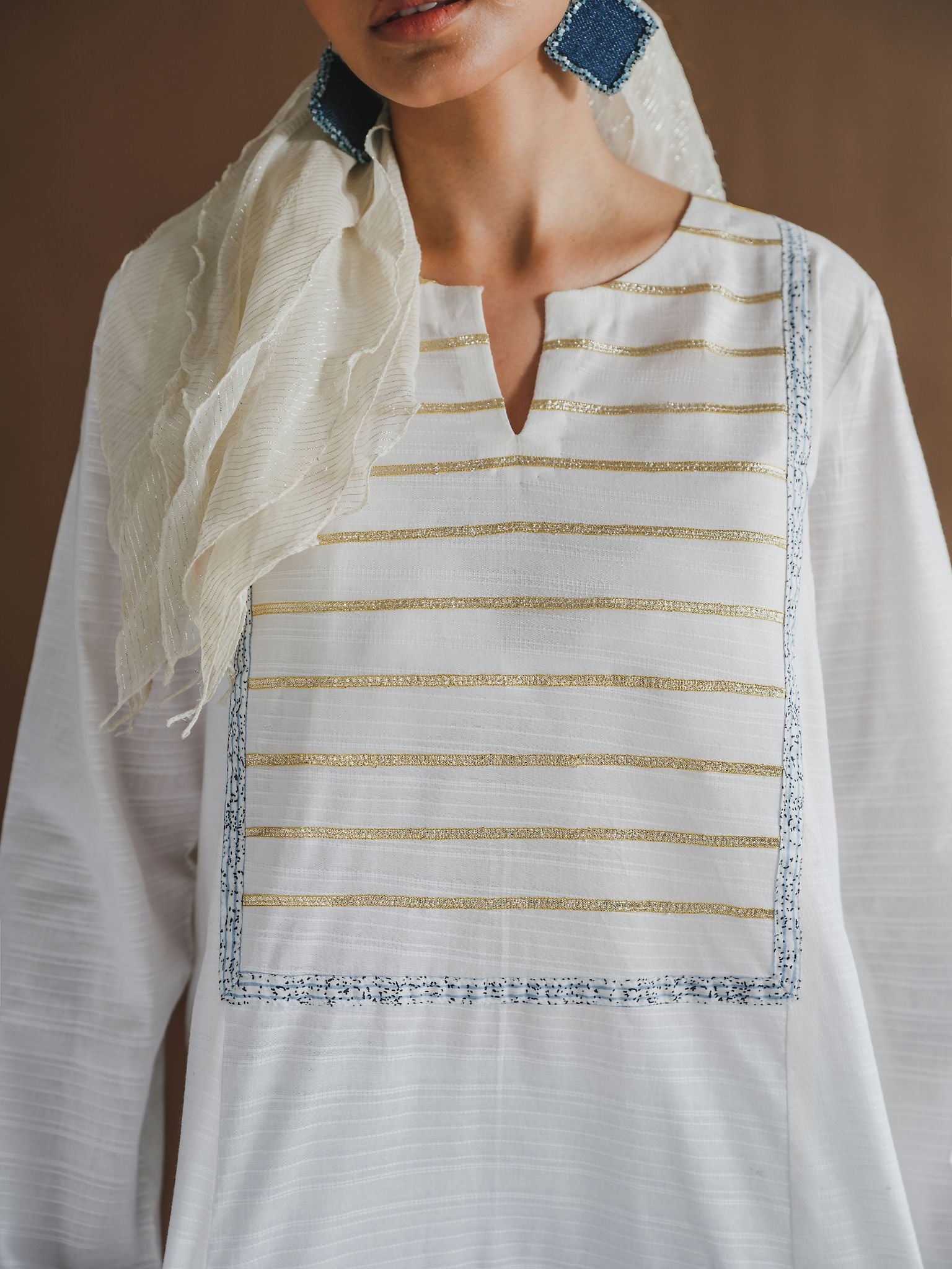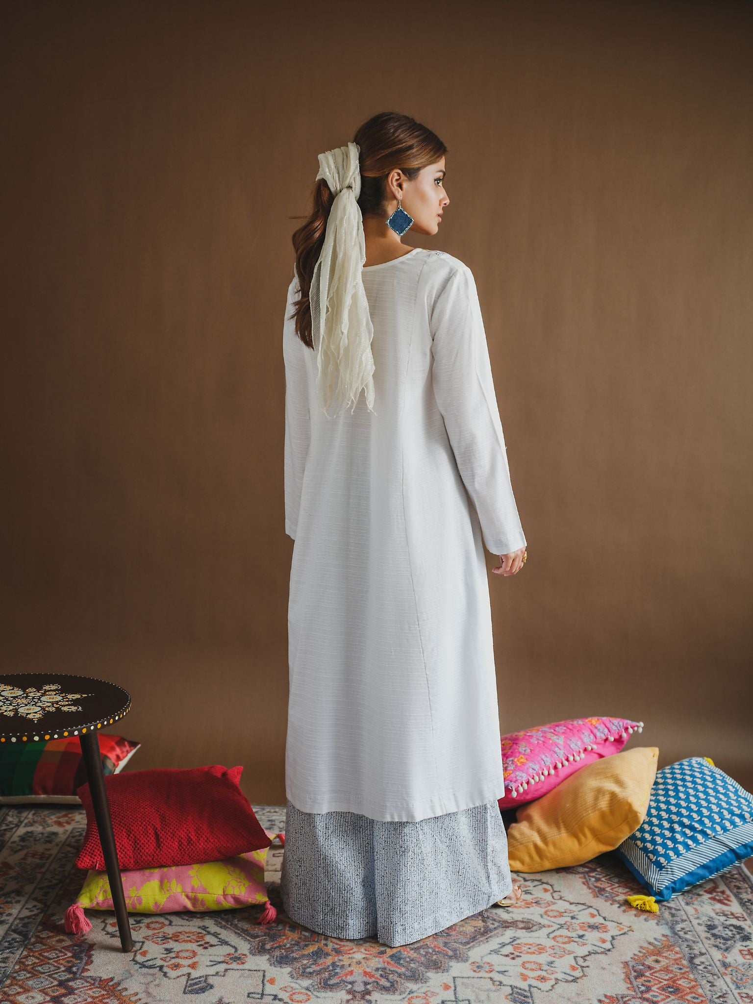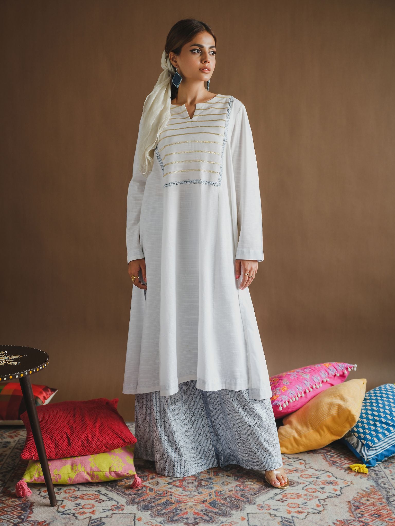 A truly enchanting outfit that exudes elegance. The kameez steals the spotlight with its stunning design delicately encircling the neckline, adding a touch of allure and grace to the overall look. The pristine white hue of the kameez embodies purity and serenity, while the self-print light shade trouser perfectly complements the ensemble, creating a harmonious and balanced aesthetic.