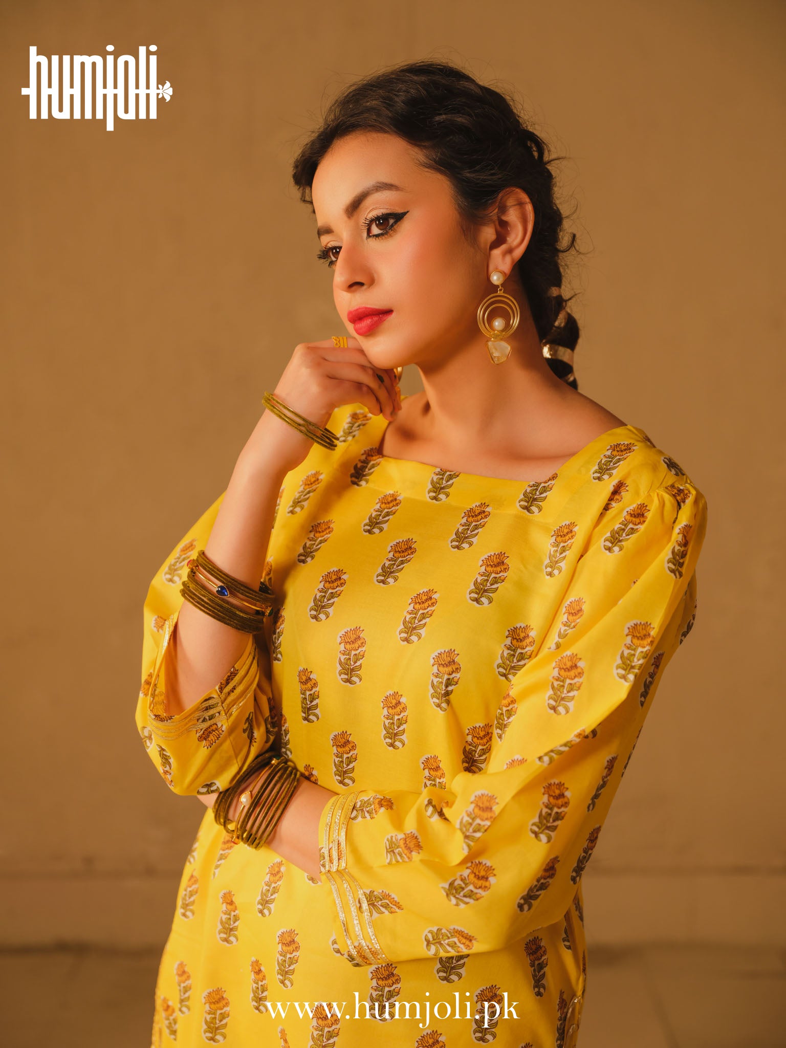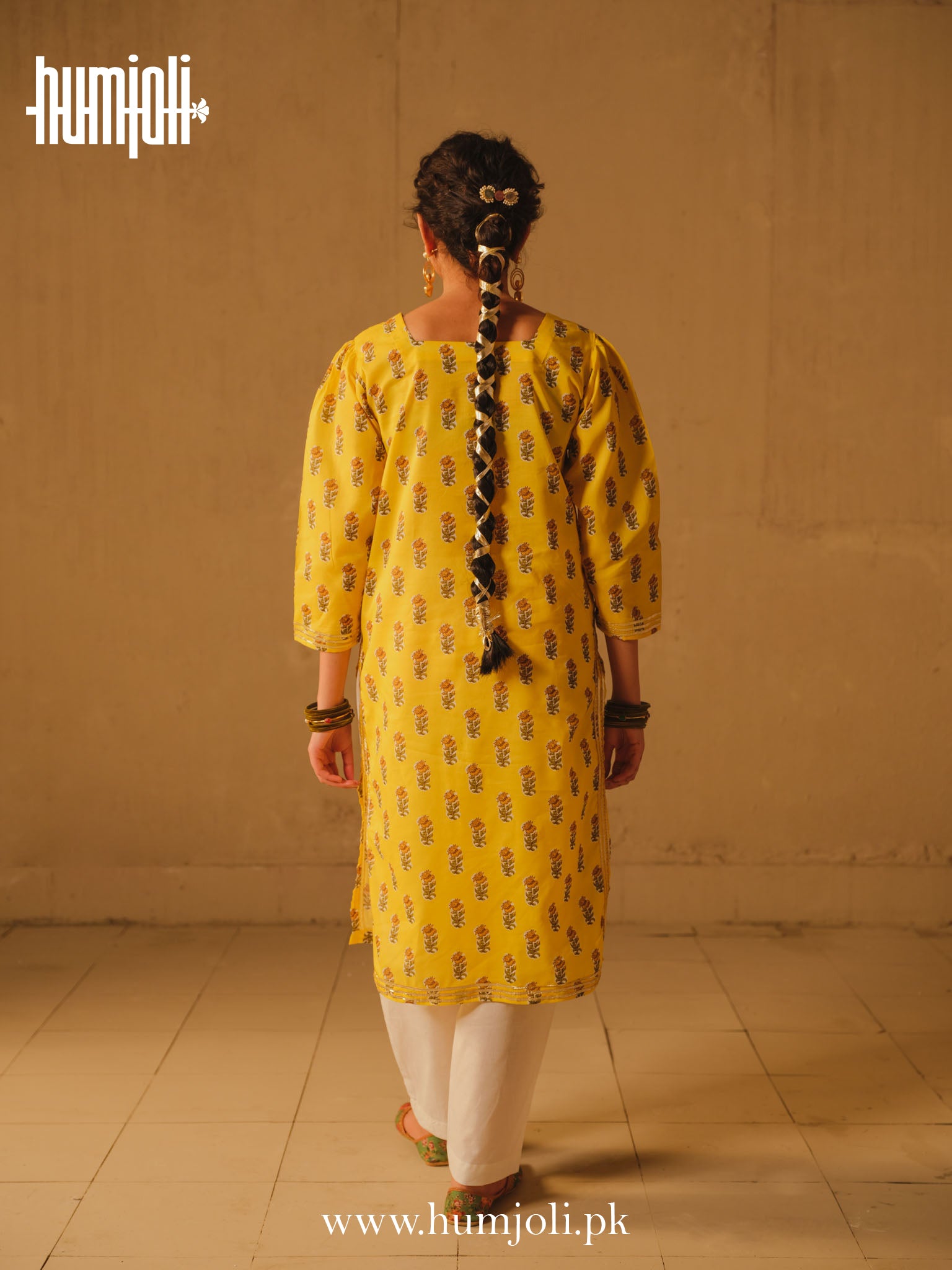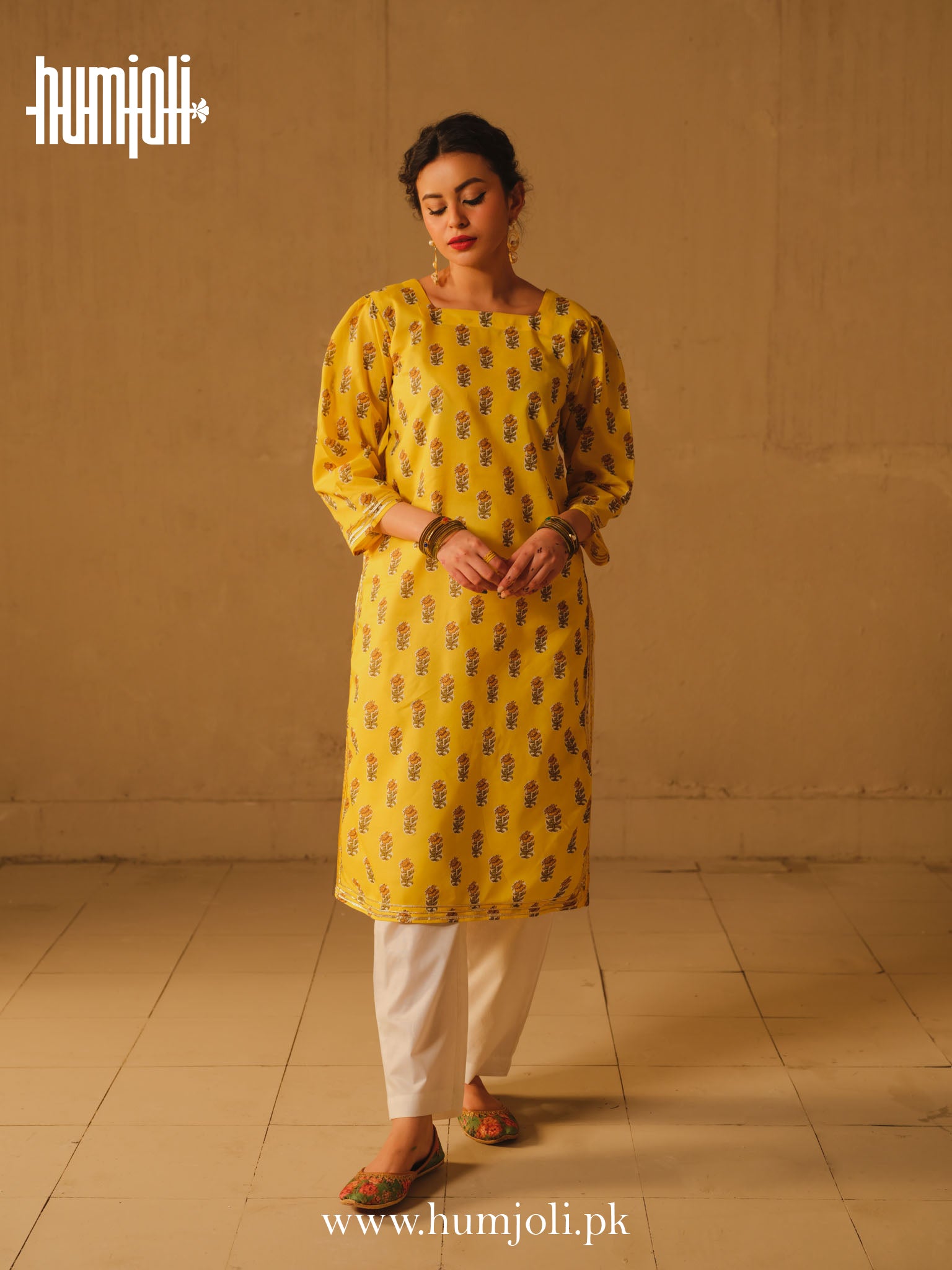 Stylish square neck with gotta work on puffy sleeves and daman is designed for desi modern everyday look.