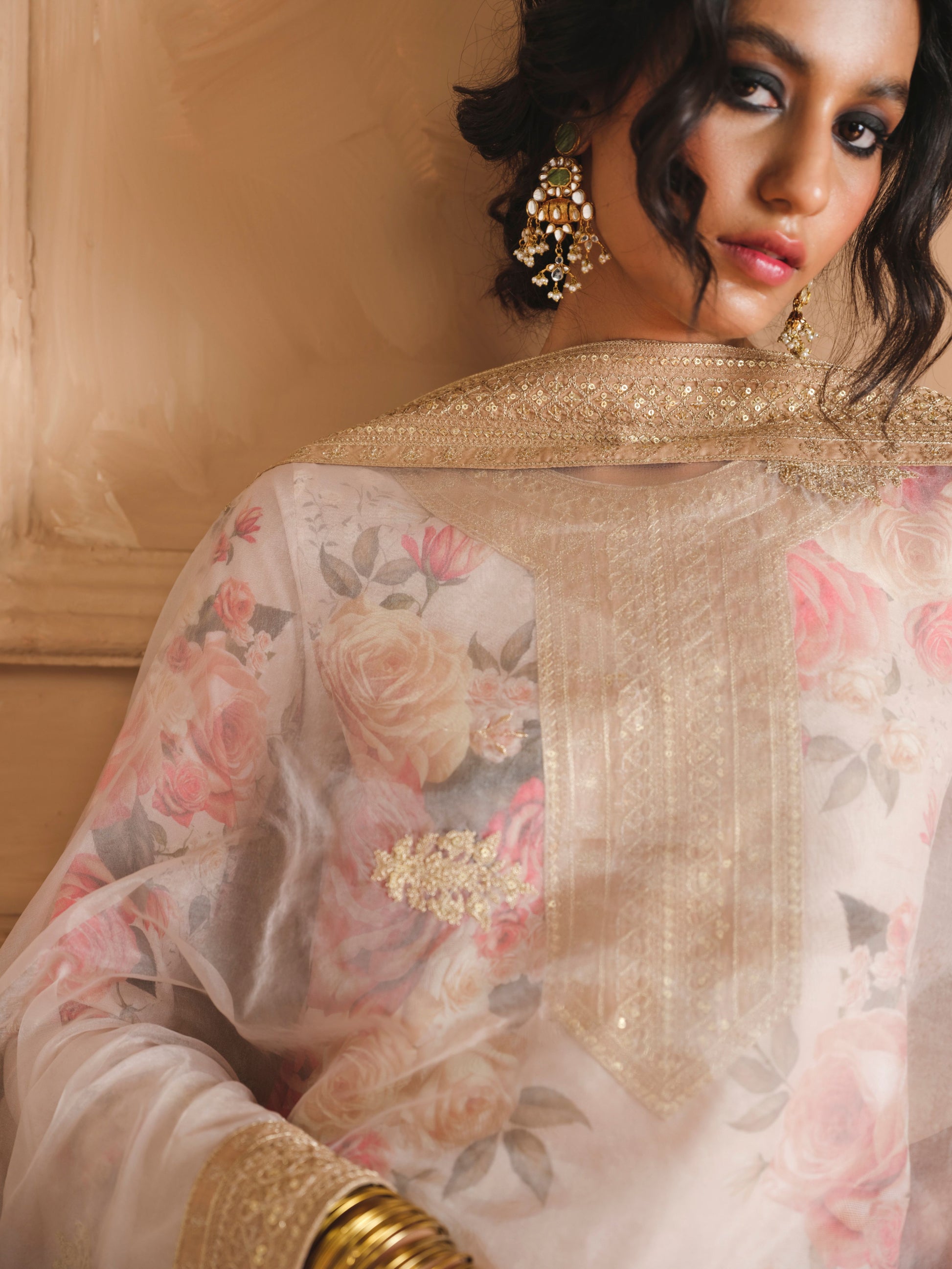 This outfit is specially Designed with Premium printed Lawn and detailed Embroidered work. The shirt has several Embroidered details on neck ,sleeves and Plazo ,paired with organza embroidered Dupatta perfect for your special day .