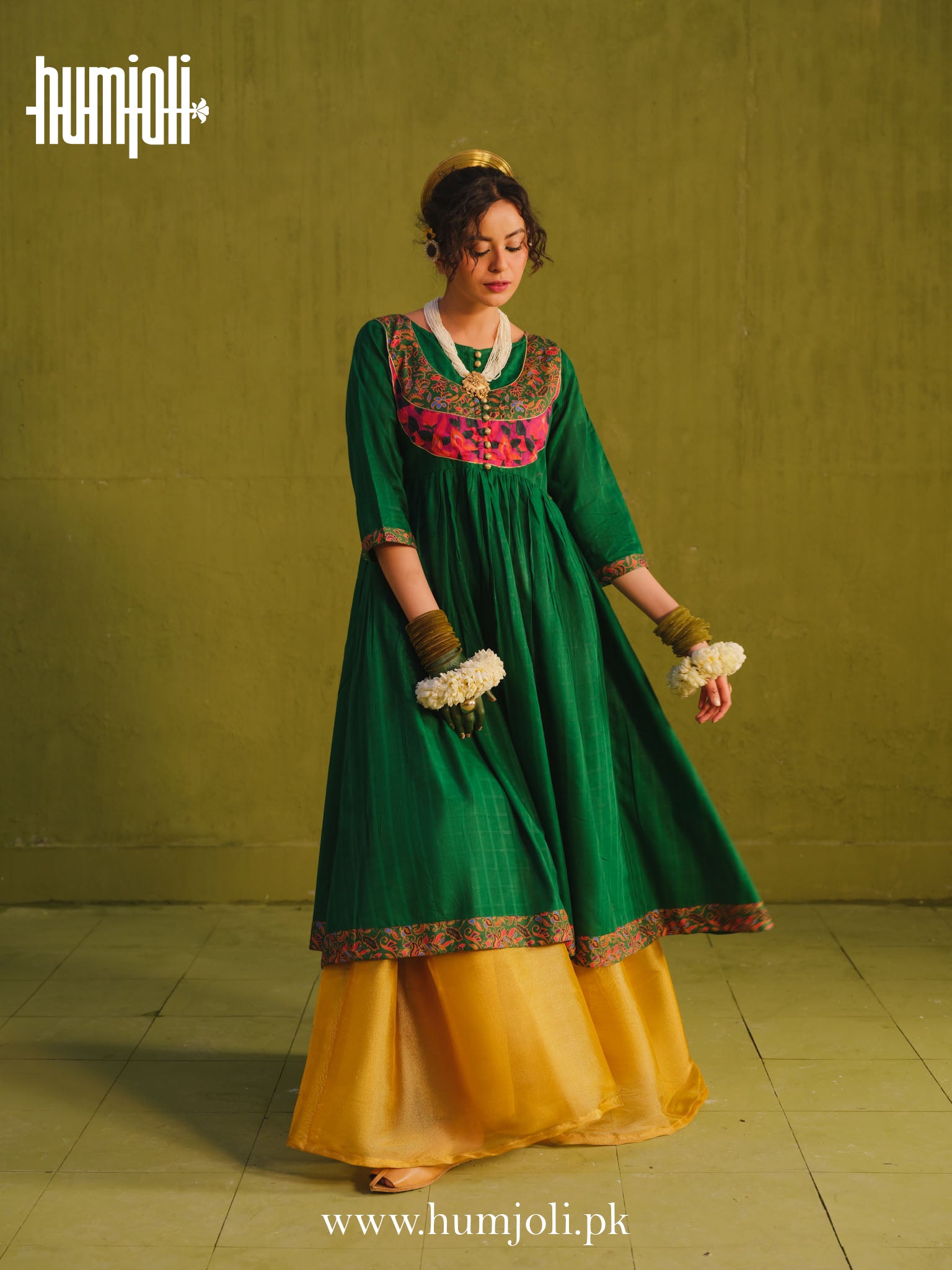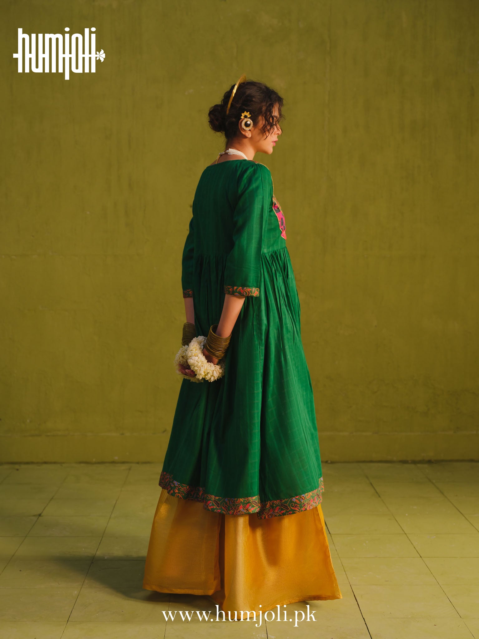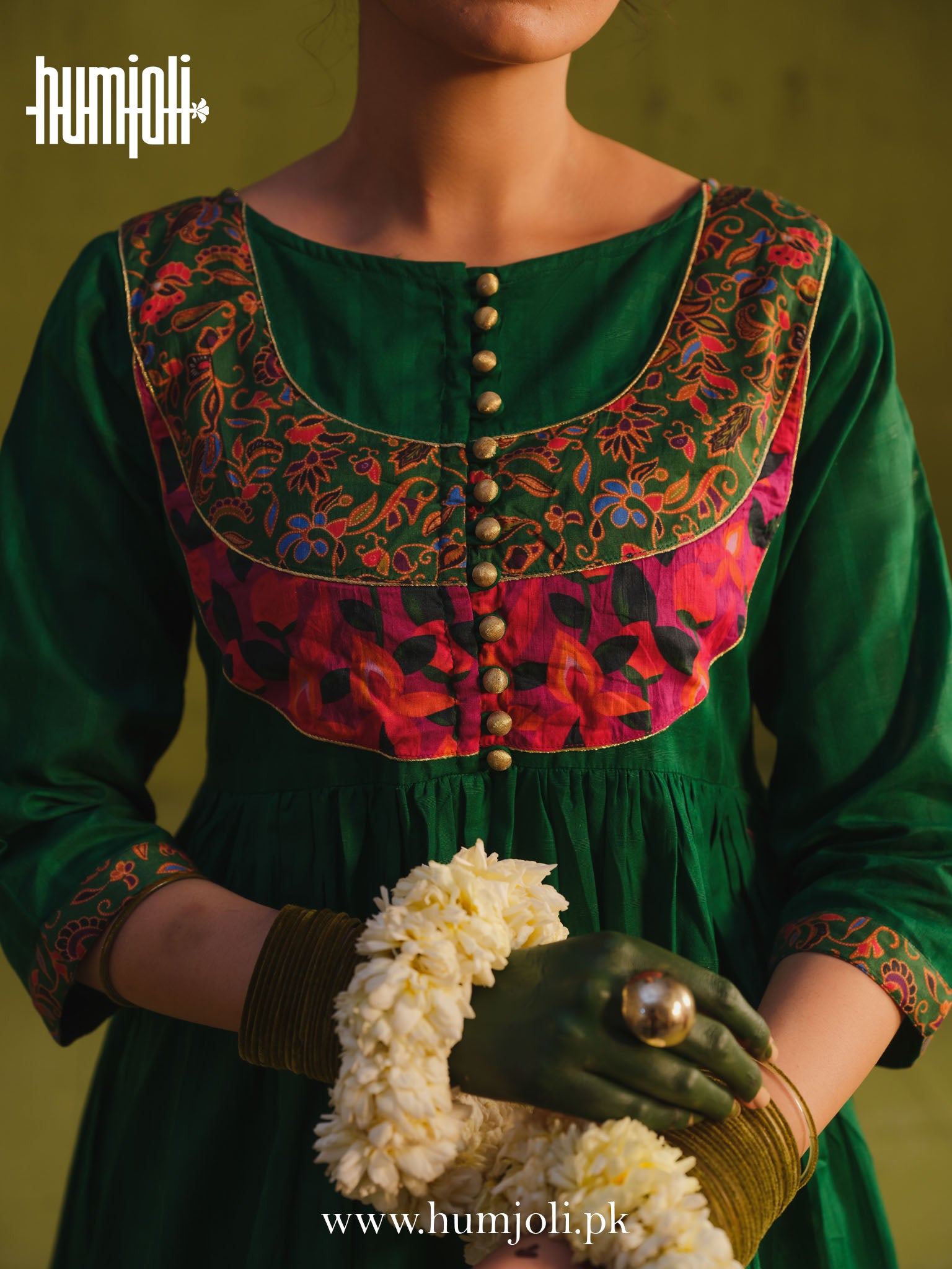 This dramatic green is most desirable outfit which is designed with combination of 2 layers pink prints and handmade buttons with beautiful daman and sleeves piping.