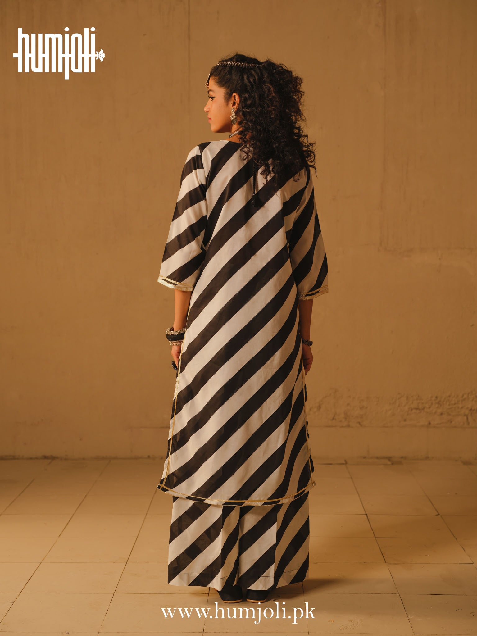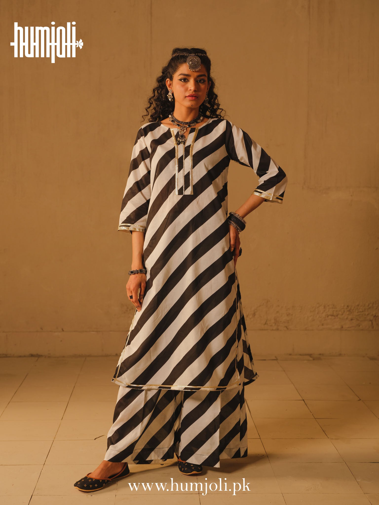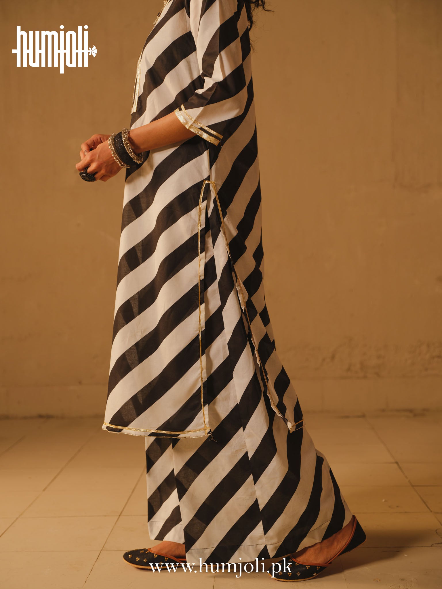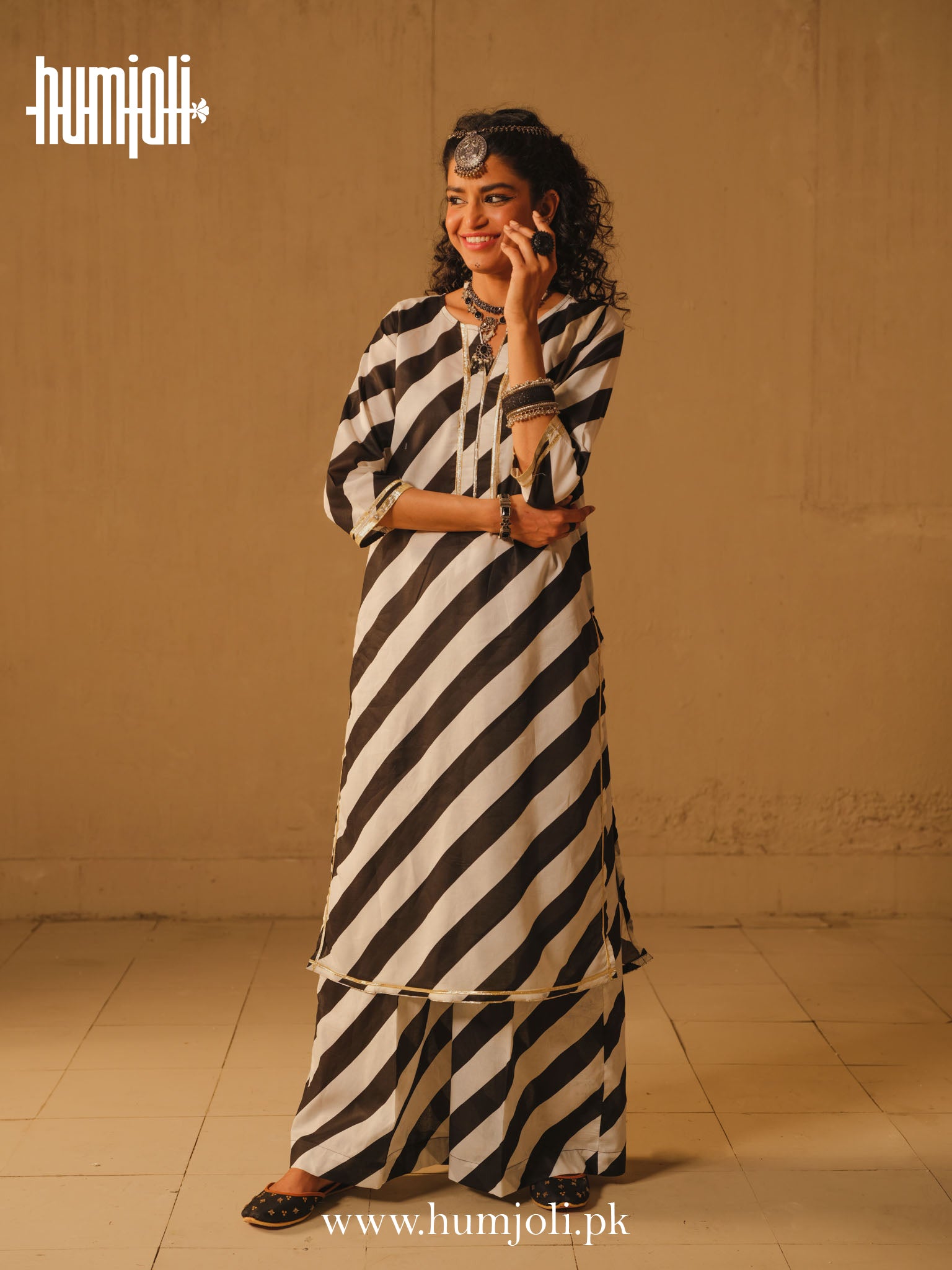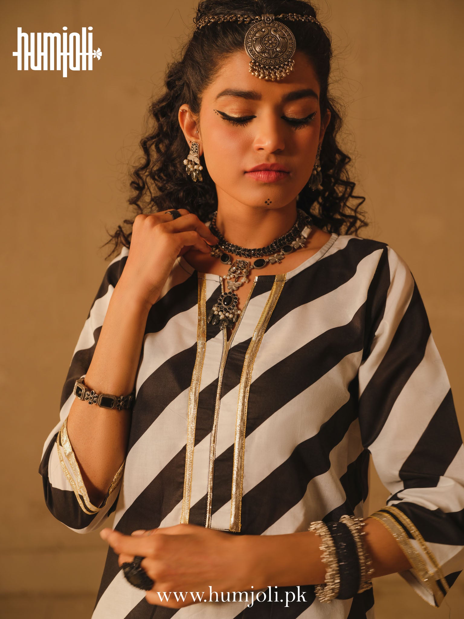 Black and white is style absolute and design with gotta paati on neck ,sleeves and daman .
