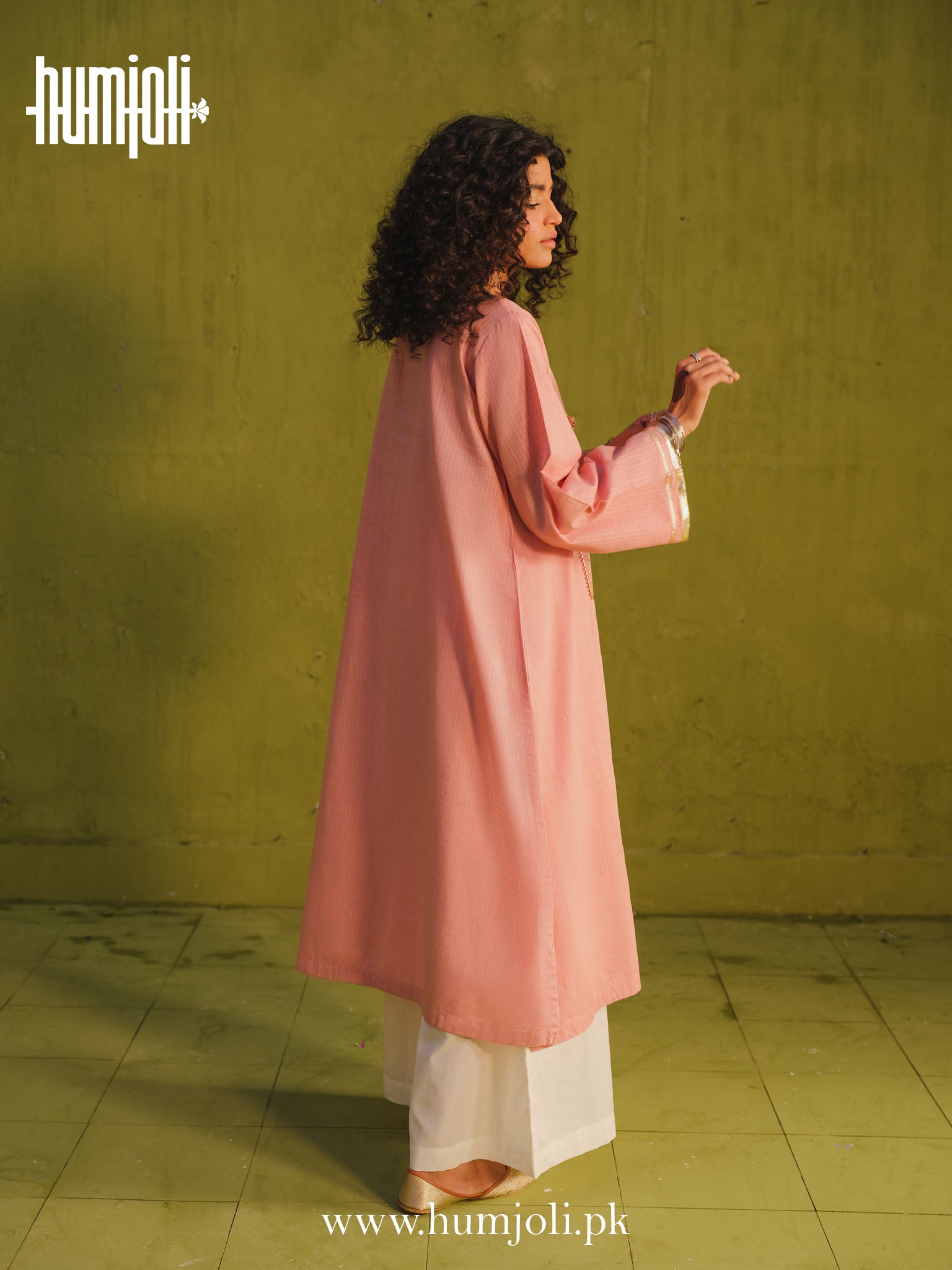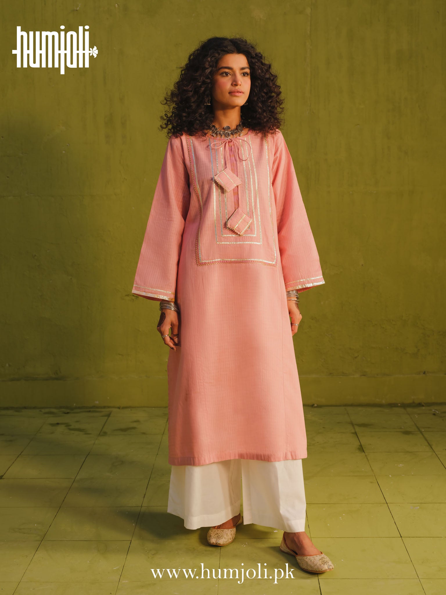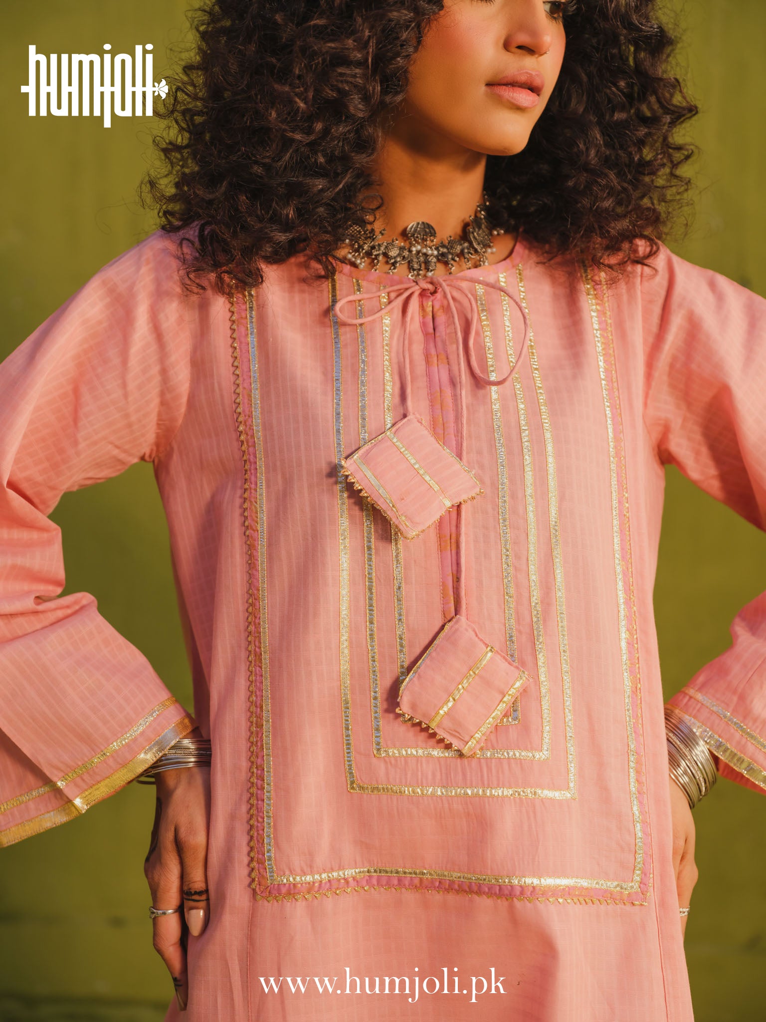 This pastel color A line long shirt with beautiful gotta stripes on front neck embellish with tussels and gotta pati on sleeves is perfect for ur classy look.