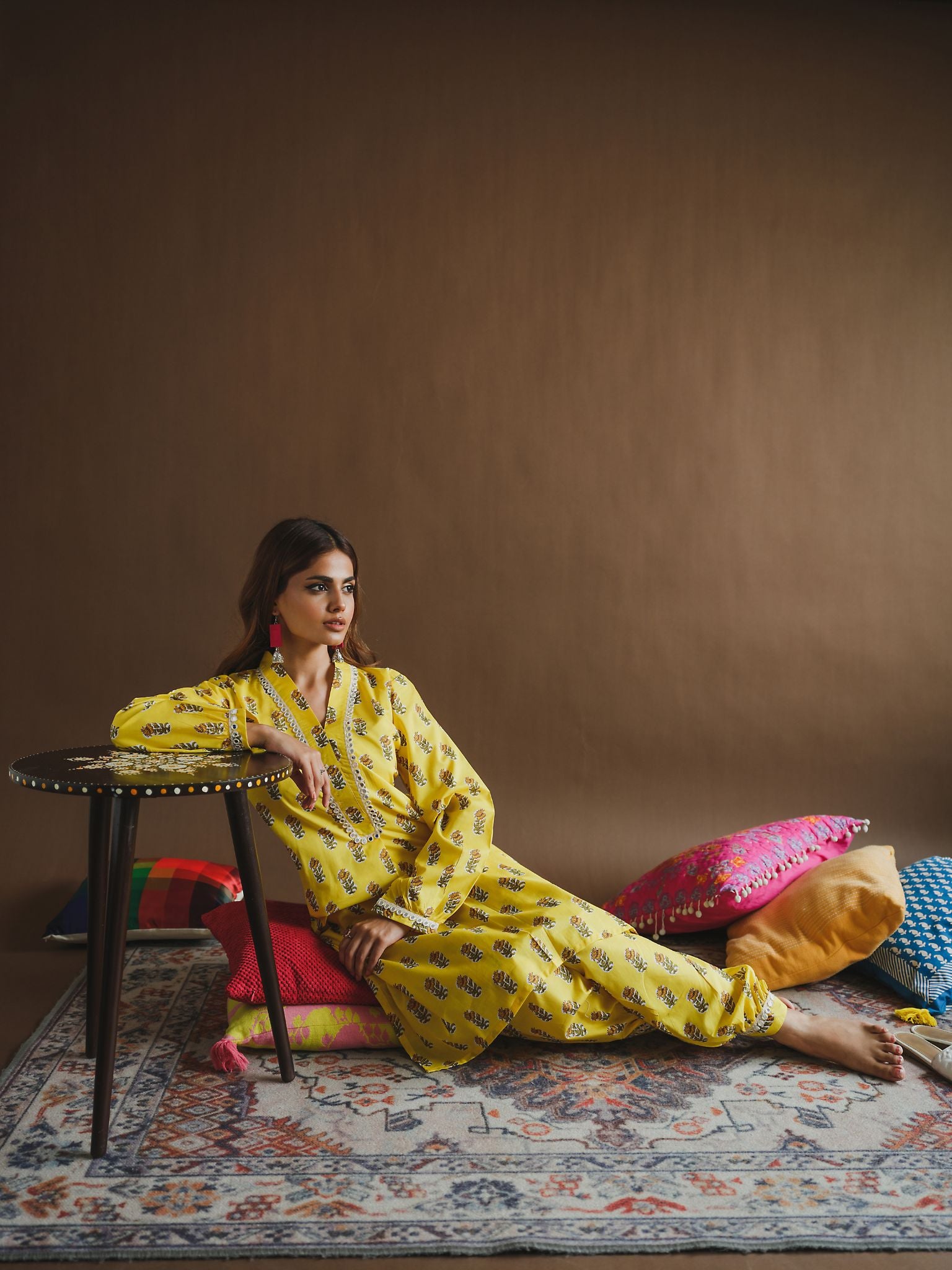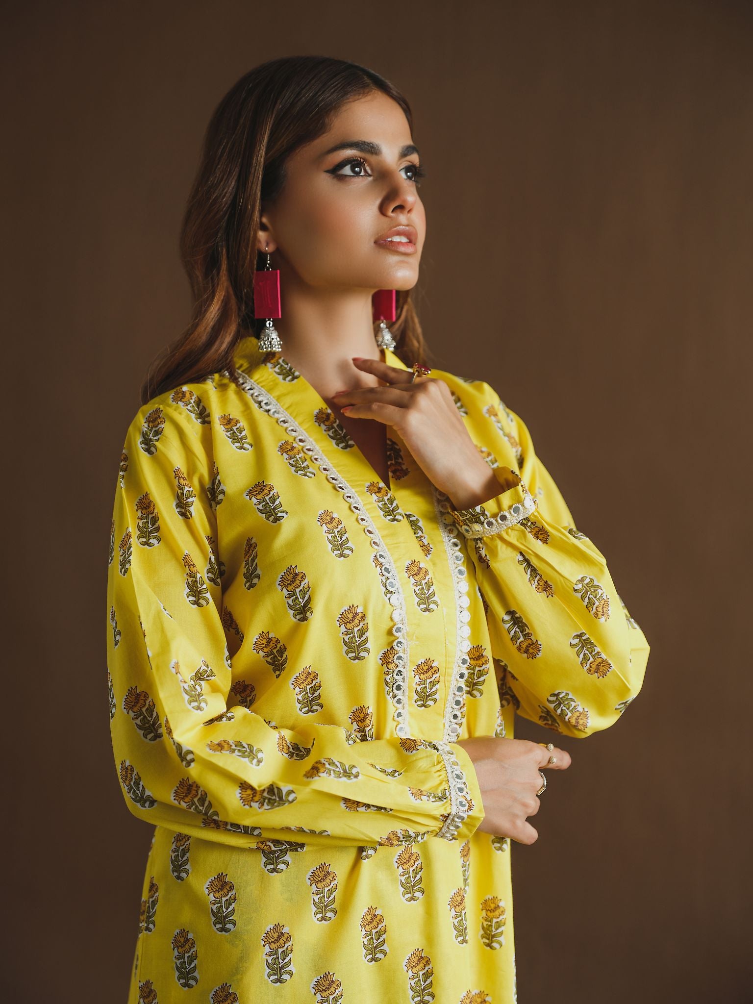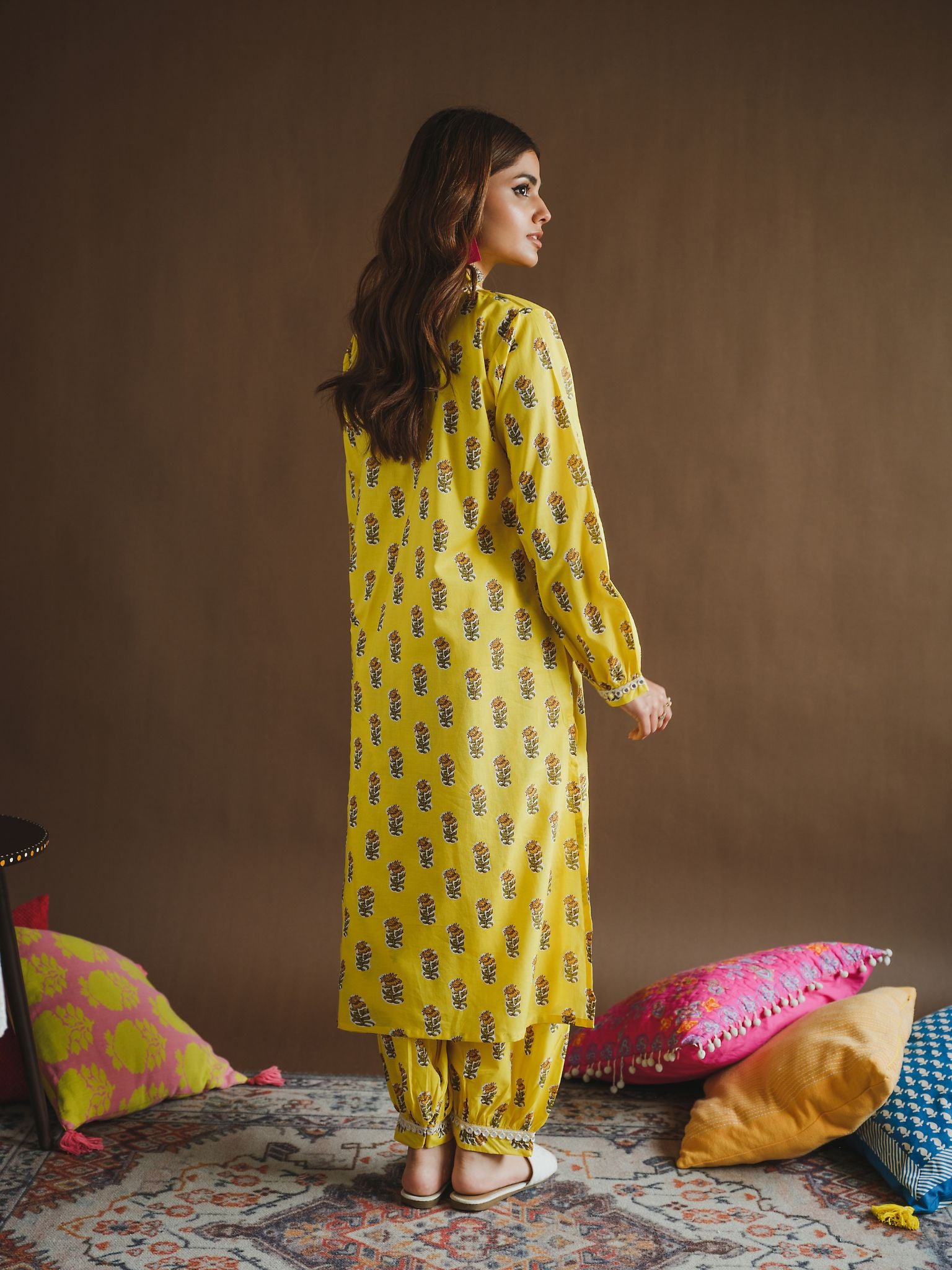 Experience the allure of exceptional craftsmanship as this stunning ensemble is designed with utmost care and features beautiful lacework delicately adorning the kameez and its sleeves. The vibrant yellow hue and breathtaking print add a touch of radiance, making you the center of attention at any occasion.