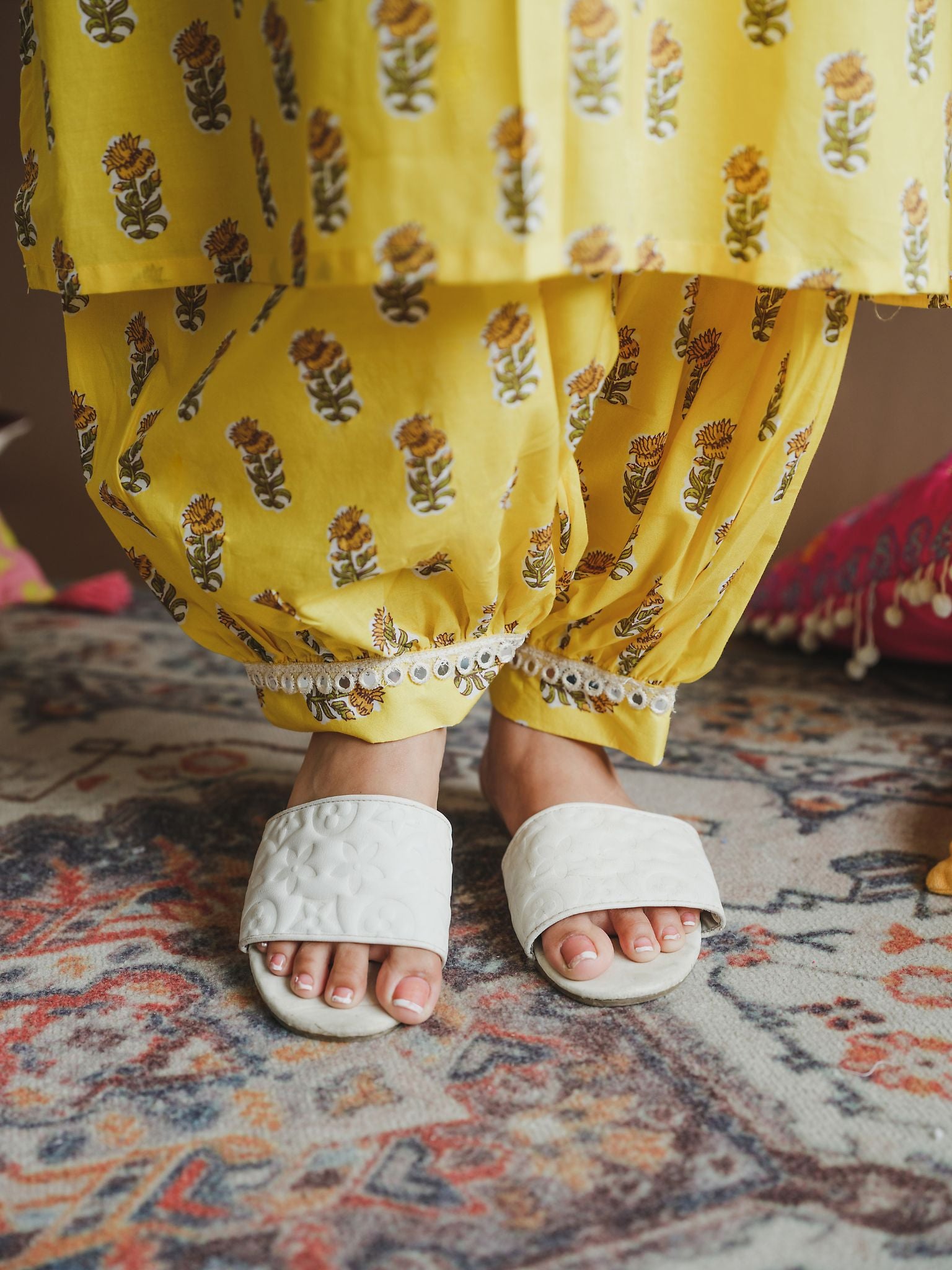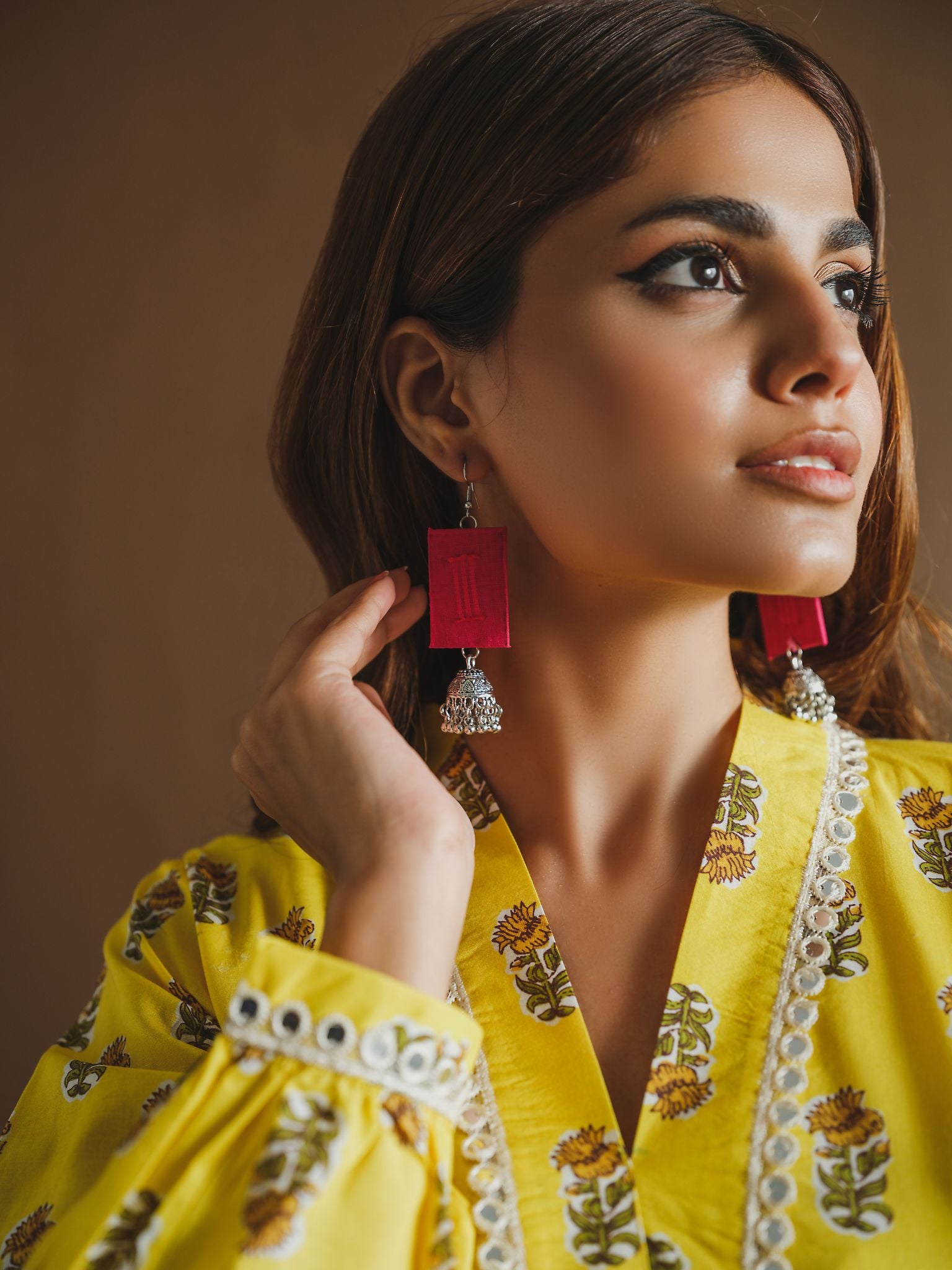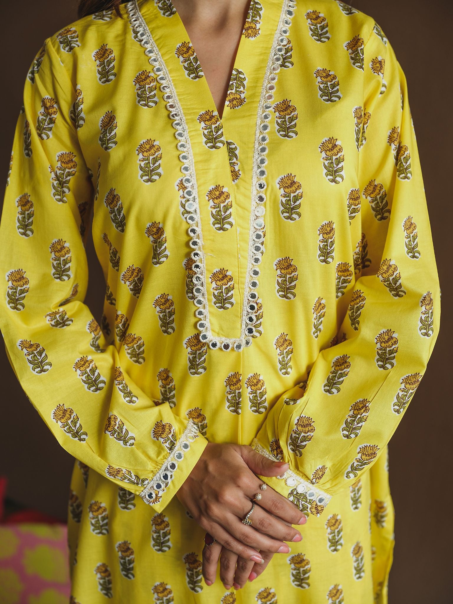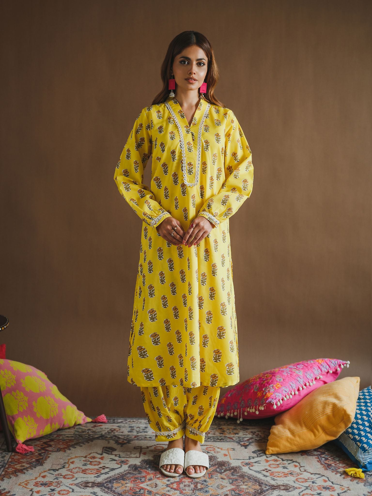 Experience the allure of exceptional craftsmanship as this stunning ensemble is designed with utmost care and features beautiful lacework delicately adorning the kameez and its sleeves. The vibrant yellow hue and breathtaking print add a touch of radiance, making you the center of attention at any occasion.