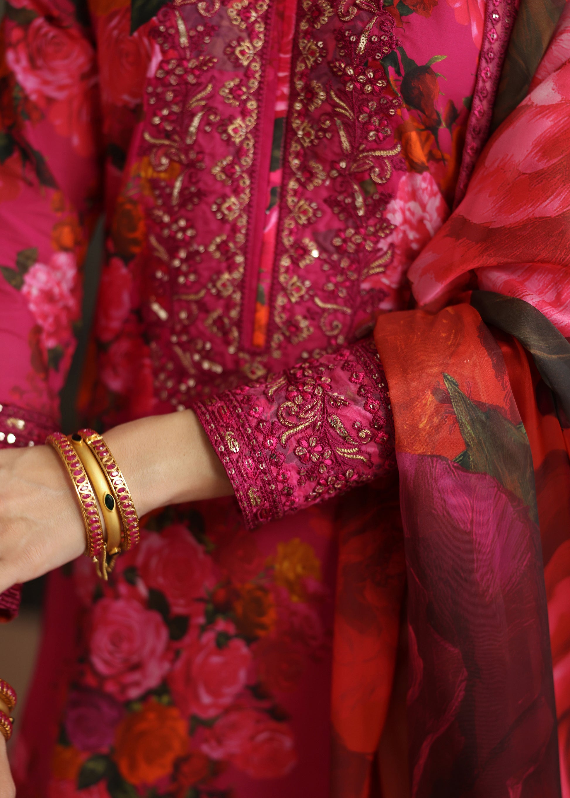 This outfit is specially Designed with Premium printed Lawn and detailed Embroidered work. The shirt has several Embroidered details on neck ,sleeves and Plazo ,paired with Printed Silk embroidered Dupatta perfect for your special day .