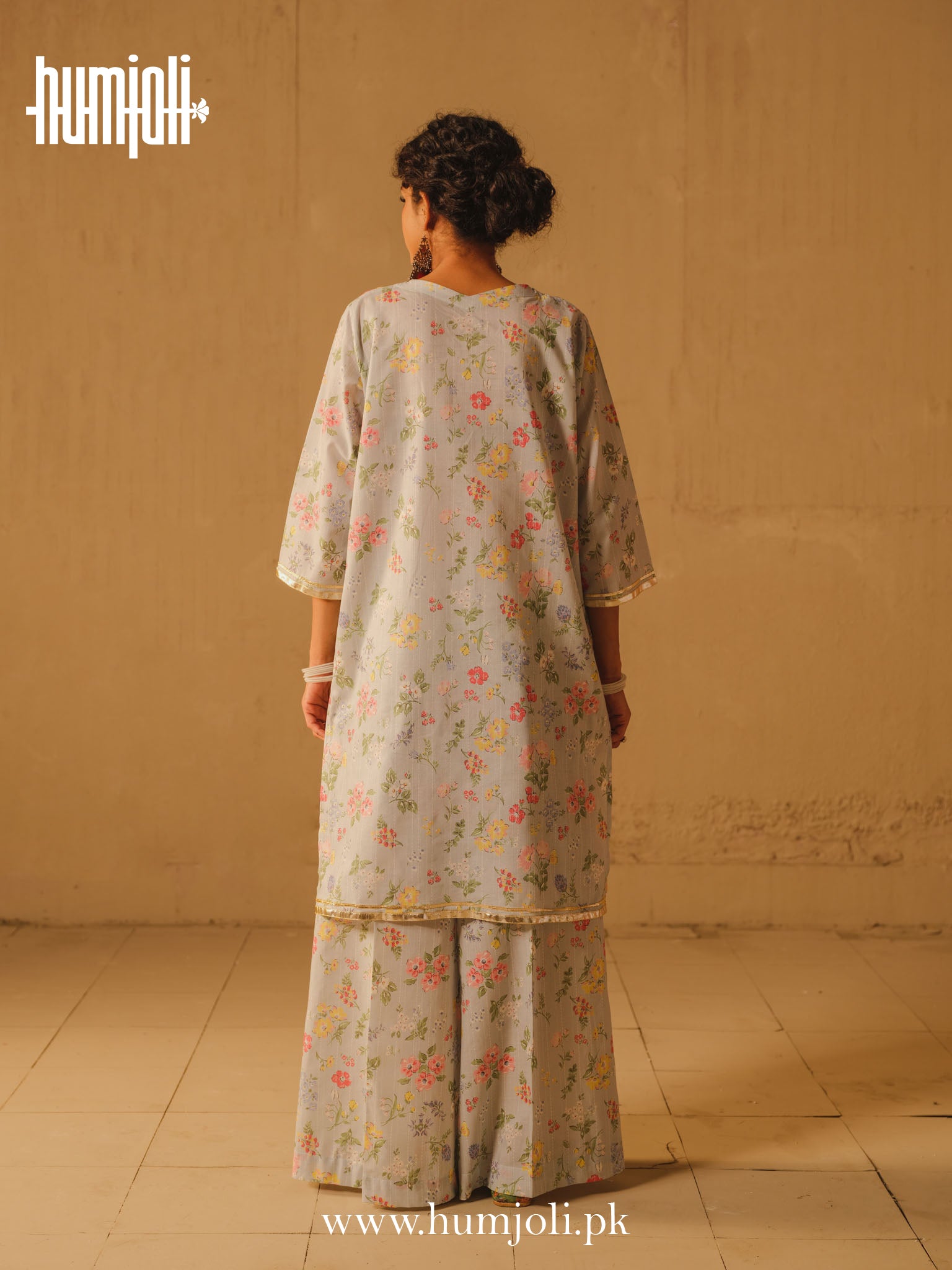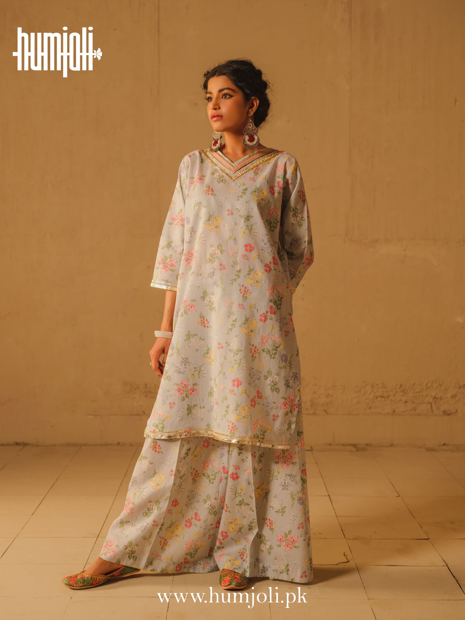 Exude grace with this multicoloured loose styled shirt with designer v neck work ,gotta pati on sleeves and daman paired with sharara pants.