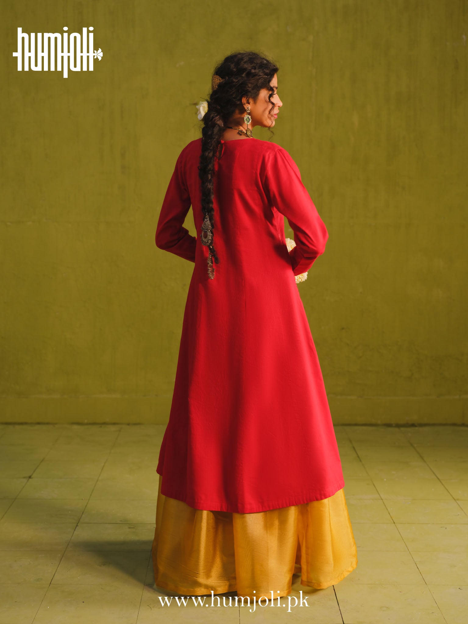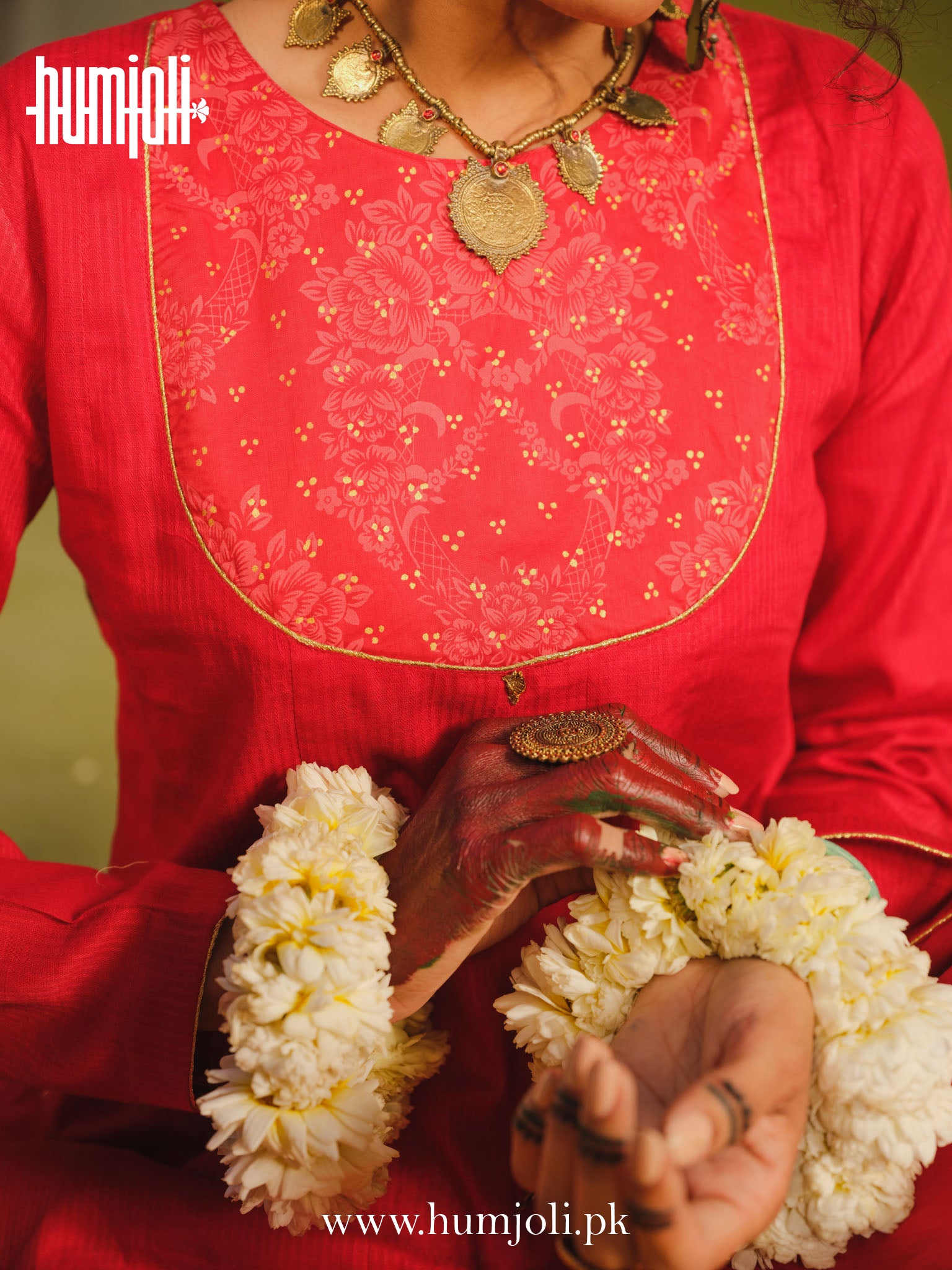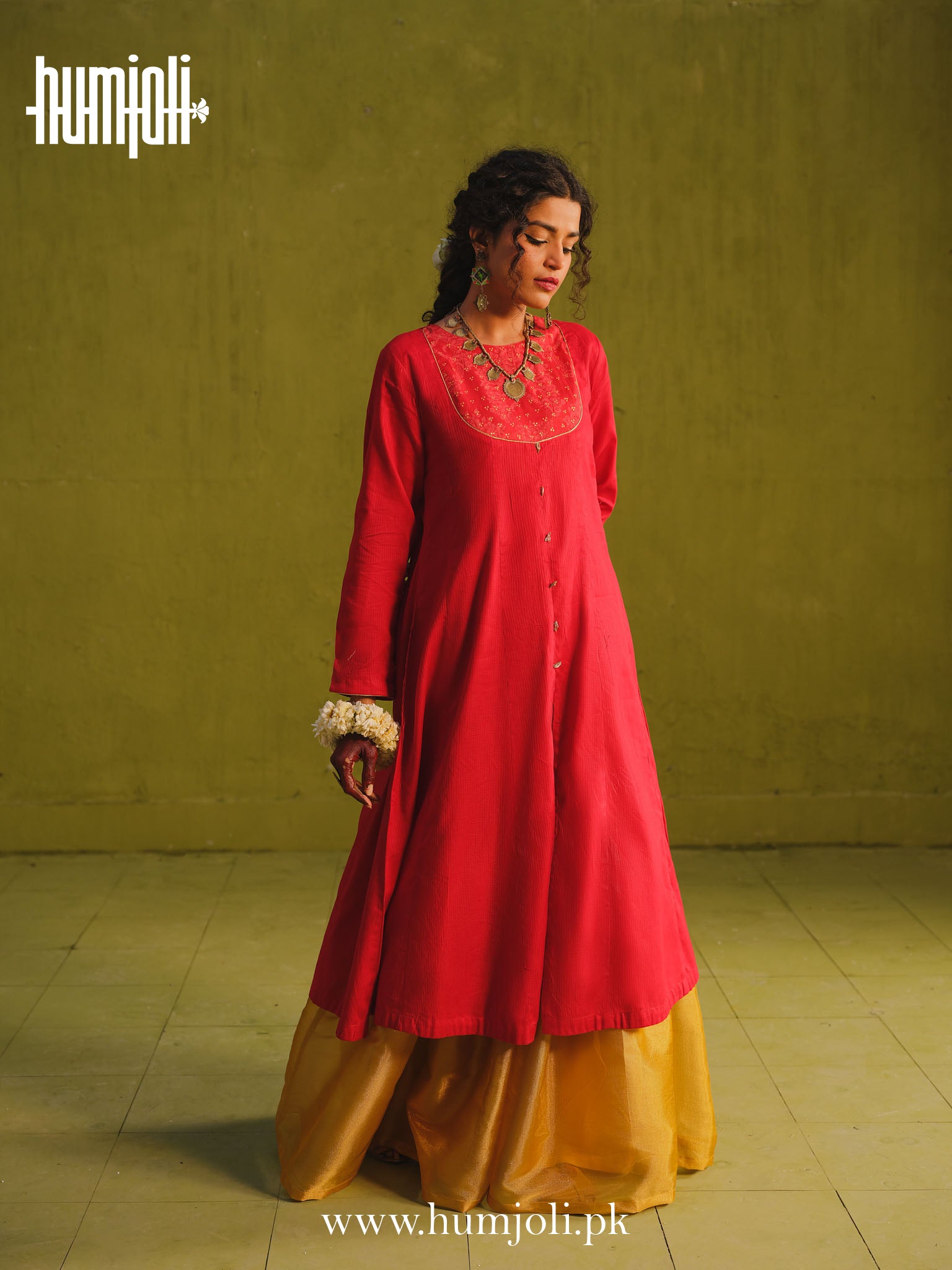 This beautiful plain red long frock has a nice extra flare with a printed bib outline embellished with gotta work on front.