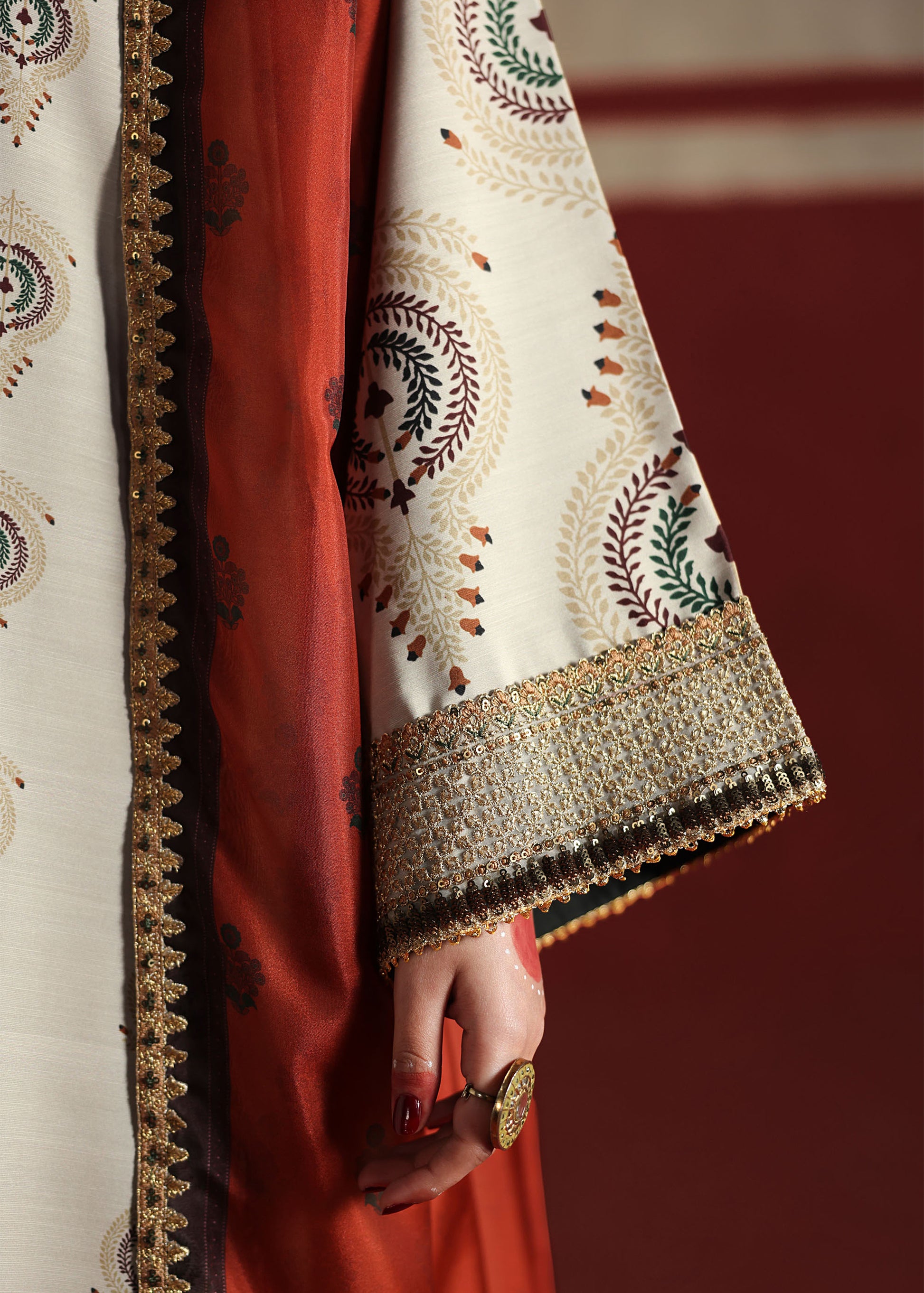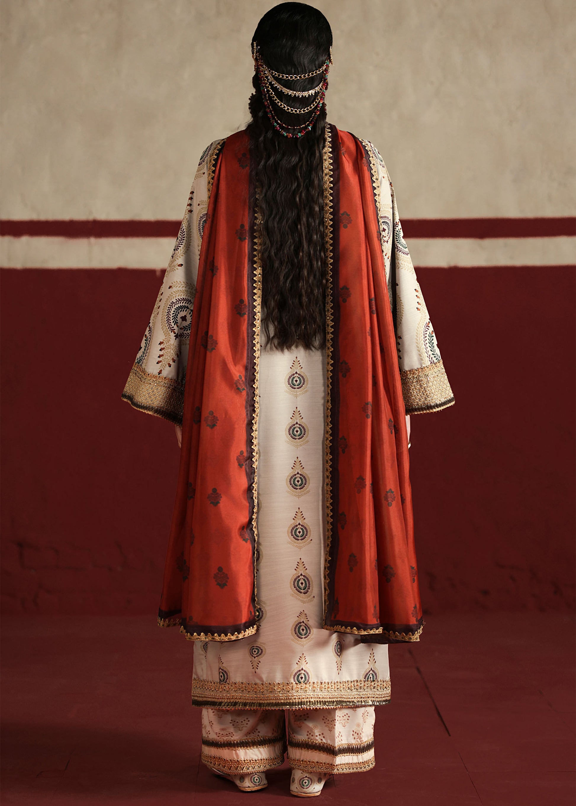 - Matching silk dupatta with gold Embroided edging