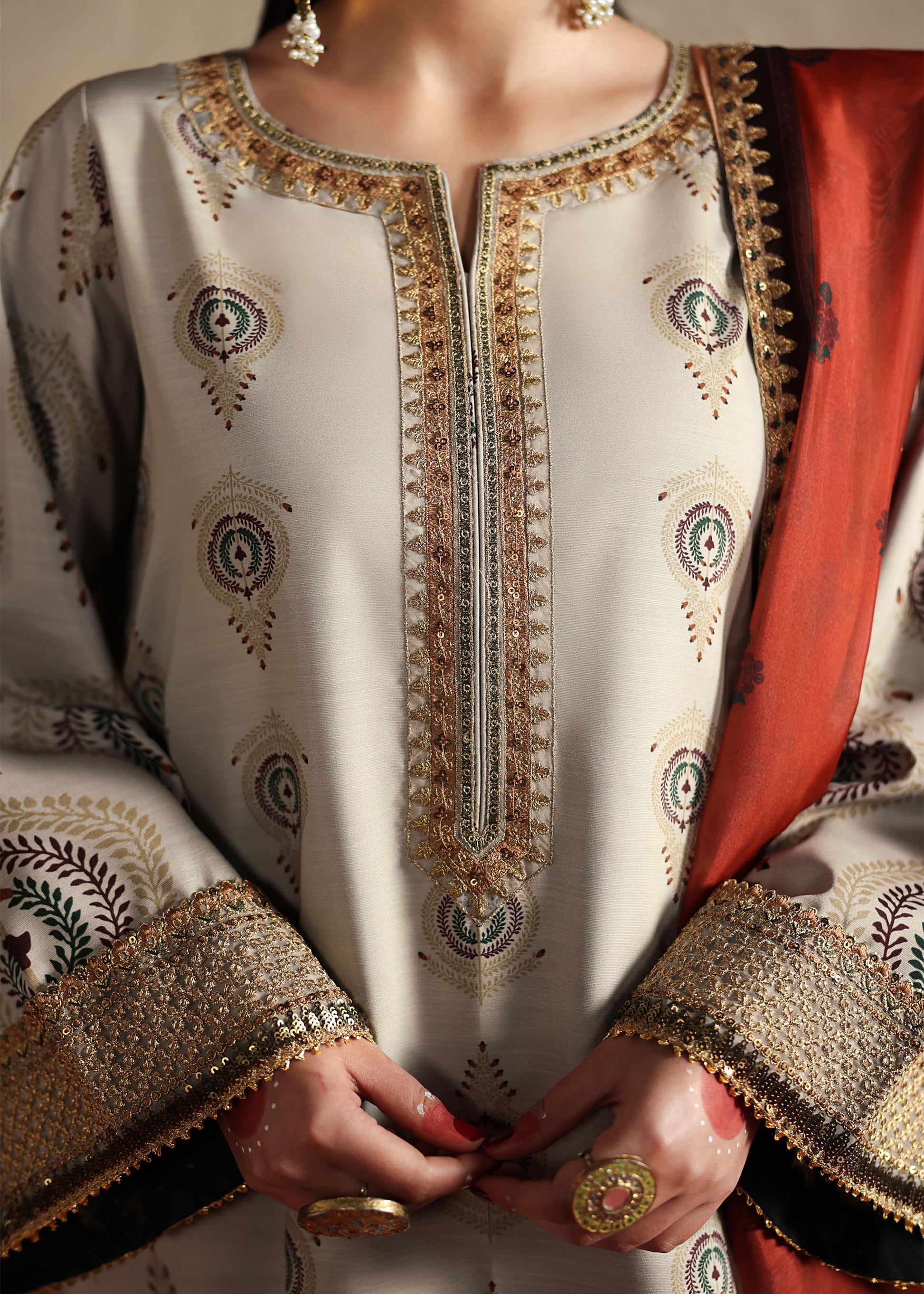 - Gold embroidery on neckline and borders